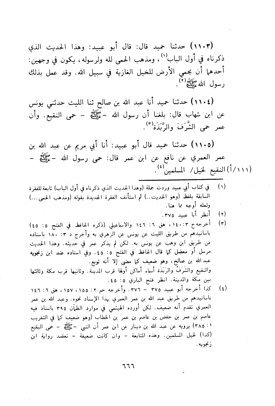 1105 - قَالَ أَبُو عُبَيْدٍ: أنا أَبُو مَرْيَمَ، عَنْ عَبْدِ اللَّهِ بْنِ عُمَرَ الْعُمَرِيِّ، عَنْ نَافِعٍ، عَنِ ابْنِ عُمَرَ، قَالَ: §حَمَى رَسُولُ اللَّهِ صَلَّى اللهُ عَلَيْهِ وَسَلَّمَ النَّقِيعَ لِخَيْلِ الْمُسْلِمِينَ "