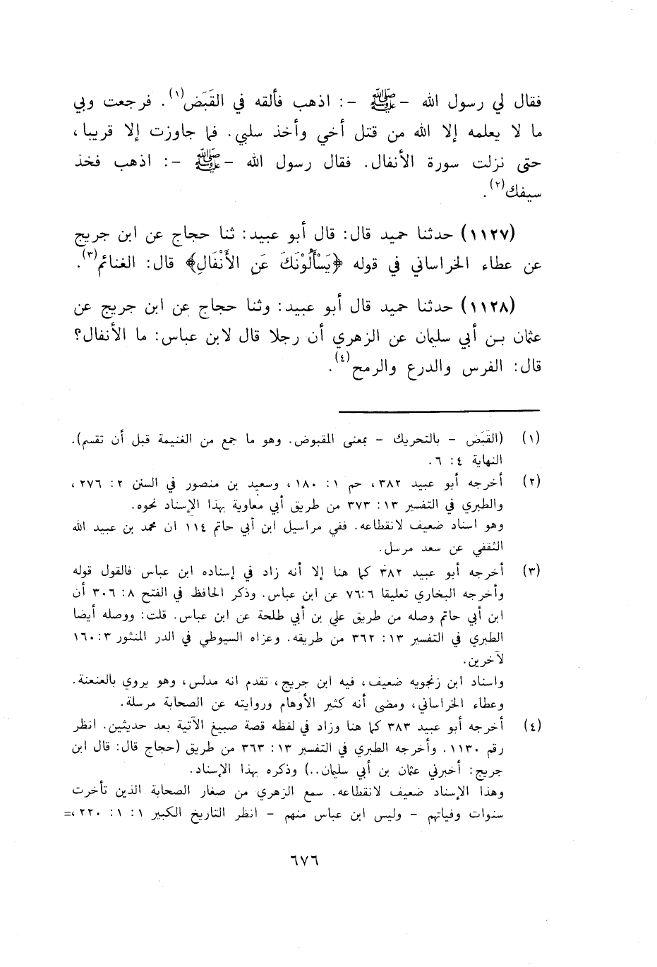 1128 - قَالَ أَبُو عُبَيْدٍ: وَثَنَا حَجَّاجٌ، عَنِ ابْنِ جُرَيْجٍ، عَنْ عُثْمَانَ بْنِ أَبِي سُلَيْمَانَ، عَنِ الزُّهْرِيِّ أَنَّ رَجُلًا، قَالَ لِابْنِ عَبَّاسٍ: §مَا الْأَنْفَالُ؟ قَالَ: «الْفَرَسُ وَالدِّرْعُ وَالرُّمْحُ»