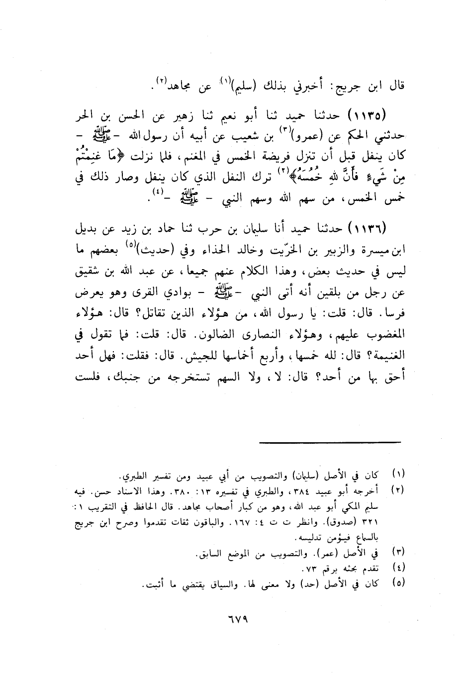 1136 - أنا سُلَيْمَانُ بْنُ حَرْبٍ، ثنا حَمَّادُ بْنُ زَيْدٍ، عَنْ بُدَيْلِ بْنِ مَيْسَرَةَ، وَالزُّبَيْرِ بْنِ الْخِرِّيتِ، وَخَالِدٍ الْحَذَّاءِ، وَفِي حَدِيثِ بَعْضِهِمْ مَا لَيْسَ فِي حَدِيثِ بَعْضٍ، وَهَذَا الْكَلَامُ عَنْهُمْ جَمِيعًا، عَنْ عَبْدِ اللَّهِ بْنِ شَقِيقٍ، عَنْ رَجُلٍ مِنْ بَلْقَيْنَ أَنَّهُ أَتَى النَّبِيَّ صَلَّى اللهُ عَلَيْهِ وَسَلَّمَ بِوَادِي الْقُرَى وَهُوَ يَعْرِضُ فَرَسًا قَالَ: قُلْتُ: يَا رَسُولَ اللَّهِ، مَنْ هَؤُلَاءِ الَّذِينَ تُقَاتِلُ؟ قَالَ: §هَؤُلَاءِ الْمَغْضُوبُ عَلَيْهِمْ وَهَؤُلَاءِ النَّصَارَى الضَّالُّونَ قَالَ: قُلْتُ: فَمَا تَقُولُ فِي الْغَنِيمَةِ؟ قَالَ: لِلَّهِ خُمُسُهَا، وَأَرْبَعُ أَخْمَاسِهَا لِلْجَيْشِ؟ قَالَ: فَقُلْتُ: فَهَلْ أَحَدٌ أَحَقُّ بِهَا مِنْ أَحَدٍ؟ قَالَ: لَا، وَلَا السَّهْمُ تَسْتَخْرِجُهُ مِنْ جَنْبِكَ، فَلَسْتَ -[680]- بِأَحَقَّ بِهِ مِنْ أَخِيكَ الْمُسْلِمِ ". حَدَّثَنَا حُمَيْدٌ