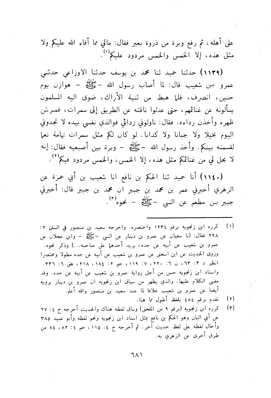 1139 - ثنا مُحَمَّدُ بْنُ يُوسُفَ، حَدَّثَنَا الْأَوْزَاعِيُّ، حَدَّثَنِي عَمْرُو بْنُ شُعَيْبٍ، قَالَ: لَمَّا أَصَابَ رَسُولُ اللَّهِ صَلَّى اللهُ عَلَيْهِ وَسَلَّمَ هَوَازِنَ يَوْمَ حُنَيْنٍ، انْصَرَفَ، فَلَمَّا هَبَطَ مِنْ ثَنِيَّةِ الْأَرَاكِ، ضَوَى إِلَيْهِ الْمُسْلِمُونَ يَسْأَلُونَهُ عَنْ غَنَائِمِهِمْ، حَتَّى عَدَلُوا نَاقَتَهُ عَنِ الطَّرِيقِ إِلَى سَمُرَاتٍ، فَمَرَشْنَ ظَهْرَهُ وَأَخَذْنَ رِدَاءَهُ فَقَالَ: «نَاوِلُونِي رِدَائِي فَوَالَّذِي نَفْسِي بِيَدِهِ §لَا تَجِدُونِي الْيَوْمَ بَخِيلًا وَلَا جَبَانًا وَلَا كَذَّابًا لَوْ كَانَ لَكُمْ مِثْلُ ثَمَرَاتِ تِهَامَةَ نَعَمًا لَقَسَمْتُهُ بَيْنَكُمْ» وَأَخَذَ رَسُولُ اللَّهِ صَلَّى اللهُ عَلَيْهِ وَسَلَّمَ وَبَرَةً بَيْنَ إِصْبَعَيْهِ فَقَالَ: «إِنَّهُ لَا يَحِلُّ لِي مِنْ غَنَائِمِكُمْ مِثْلُ هَذِهِ إِلَّا الْخُمُسَ، وَالْخُمُسُ مَرْدُودٌ فِيكُمْ» . حَدَّثَنَا حُمَيْدٌ