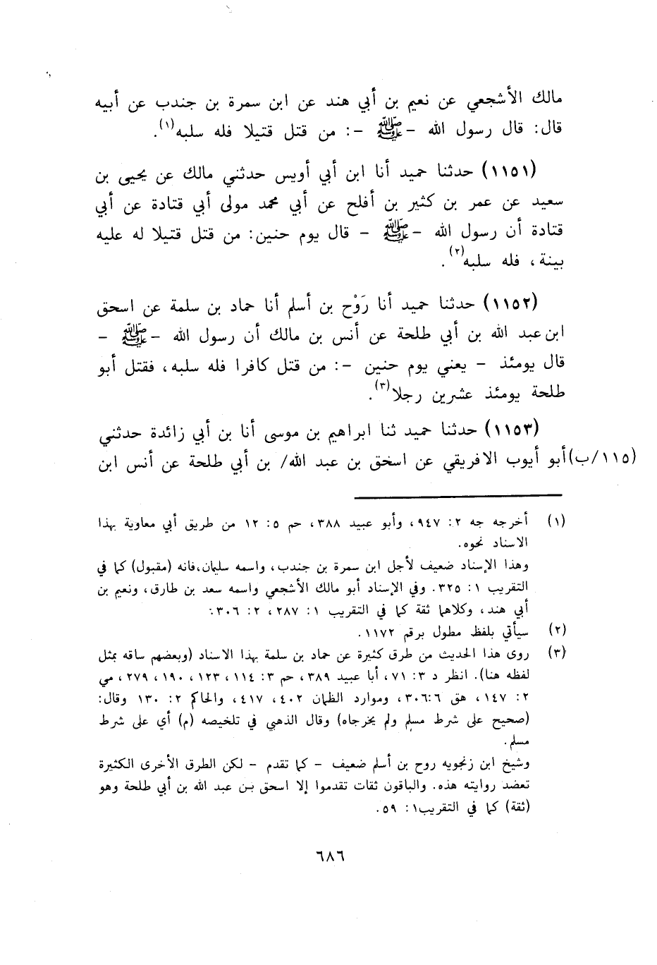 1152 - أنا رَوْحُ بْنُ أَسْلَمَ، أنا حَمَّادُ بْنُ سَلَمَةَ، عَنْ إِسْحَاقَ بْنِ عَبْدِ اللَّهِ بْنِ أَبِي طَلْحَةَ، عَنْ أَنَسِ بْنِ -[687]- مَالِكٍ، أَنَّ رَسُولَ اللَّهِ صَلَّى اللهُ عَلَيْهِ وَسَلَّمَ قَالَ يَوْمَئِذٍ - يَعْنِي: يَوْمَ حُنَيْنٍ -: «§مَنْ قَتَلَ كَافِرًا فَلَهُ سَلَبُهُ» فَقَتَلَ أَبُو طَلْحَةَ يَوْمَئِذٍ عِشْرِينَ رَجُلًا "