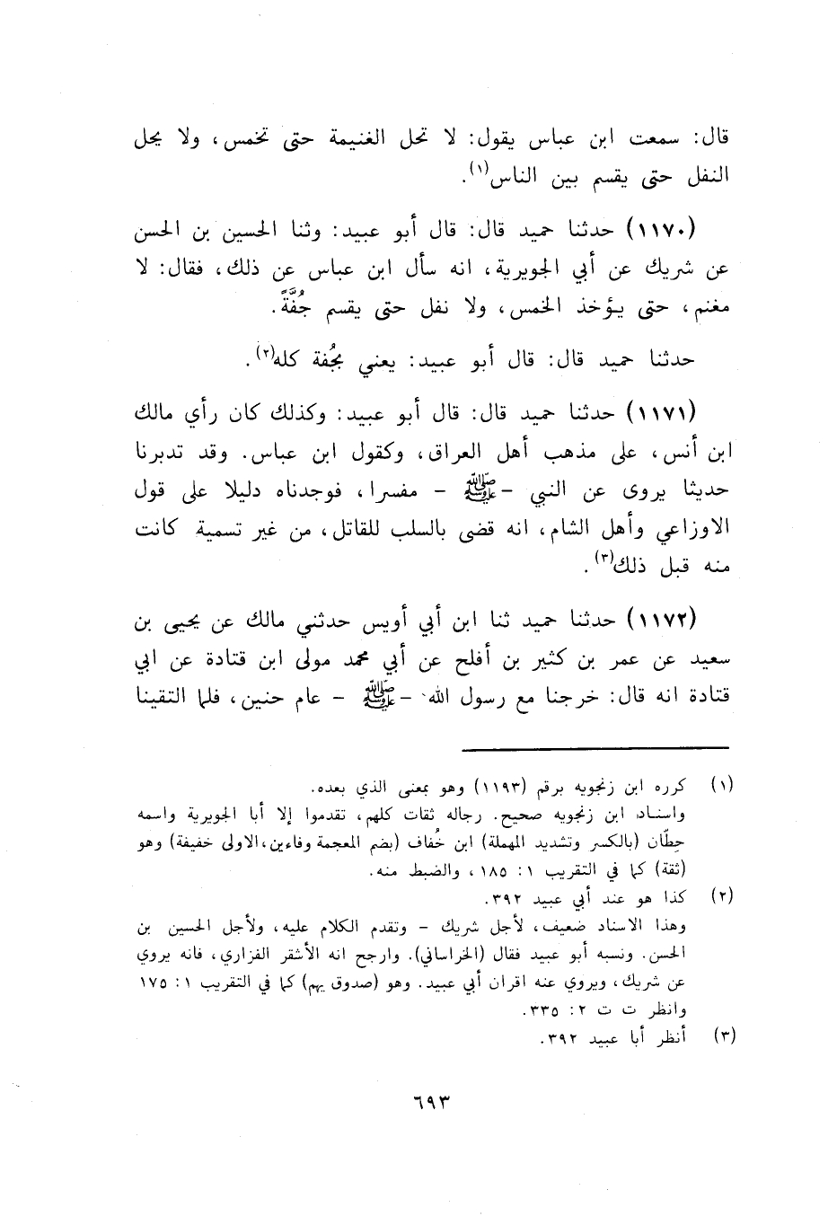 1173 - قَالَ أَبُو عُبَيْدٍ: فَقَدْ تَبَيَّنَ لَنَا أَنَّ النَّبِيَّ صَلَّى اللهُ عَلَيْهِ وَسَلَّمَ حَكَمَ لِأَبِي قَتَادَةَ بِالسَّلَبِ، مِنْ غَيْرِ أَنْ يَكُونَ نَفَّلَهُ إِيَّاهُ قَبْلَ ذَلِكَ أَلَا تَرَى أَنَّ رَسُولَ اللَّهِ صَلَّى اللهُ عَلَيْهِ وَسَلَّمَ إِنَّمَا قَالَ مَا قَالَ بَعْدَمَا قَتَلَ أَبُو قَتَادَةَ صَاحِبَهُ.؟ حَدَّثَنَا حُمَيْدٌ حَدَّثَنَا أَبُو عُبَيْدٍ،: فَهَذَا عِنْدَنَا بَيِّنٌ وَاضِحٌ، أَنَّ السَّلَبَ مَقْضِيٌّ بِهِ لِلْقَاتِلِ سُنَّةٌ مَاضِيَةٌ مِنْ رَسُولِ اللَّهِ صَلَّى اللهُ عَلَيْهِ وَسَلَّمَ جَعَلَهُ لَهُ الْإِمَامُ قَبْلَ ذَلِكَ، أَوْ لَمْ يَجْعَلْهُ لَهُ وَقَدِ احْتَجَّ قَوْمٌ بِحَدِيثِ عُمَرَ أَنَّهُ خَمَّسَ السَّلَبَ لِلْبَرَاءِ وَلَيْسَ قَوْلُ أَحَدٍ مَعَ رَسُولِ اللَّهِ صَلَّى اللهُ عَلَيْهِ وَسَلَّمَ حُجَّةً عَلَى أَنَّ حَدِيثَ عُمَرَ إِنَّمَا هُوَ حُجَّةٌ لِمَنْ يَرَى أَنْ لَا يُخَمَّسَ السَّلَبُ لِلْآخَرِينَ أَلَا تَسْمَعُ إِلَى قَوْلِهِ: إِنَّا كُنَّا لَا نُخَمِّسُ السَّلَبَ؟ وَقَوْلِهِ: كَانَ أَوَّلُ سَلَبٍ خُمِّسَ فِي الْإِسْلَامِ سَلَبَ الْبَرَاءِ، بَلَغَ مَالًا وَأَنَا خَامِسُهُ. حَدَّثَنَا حُمَيْدٌ