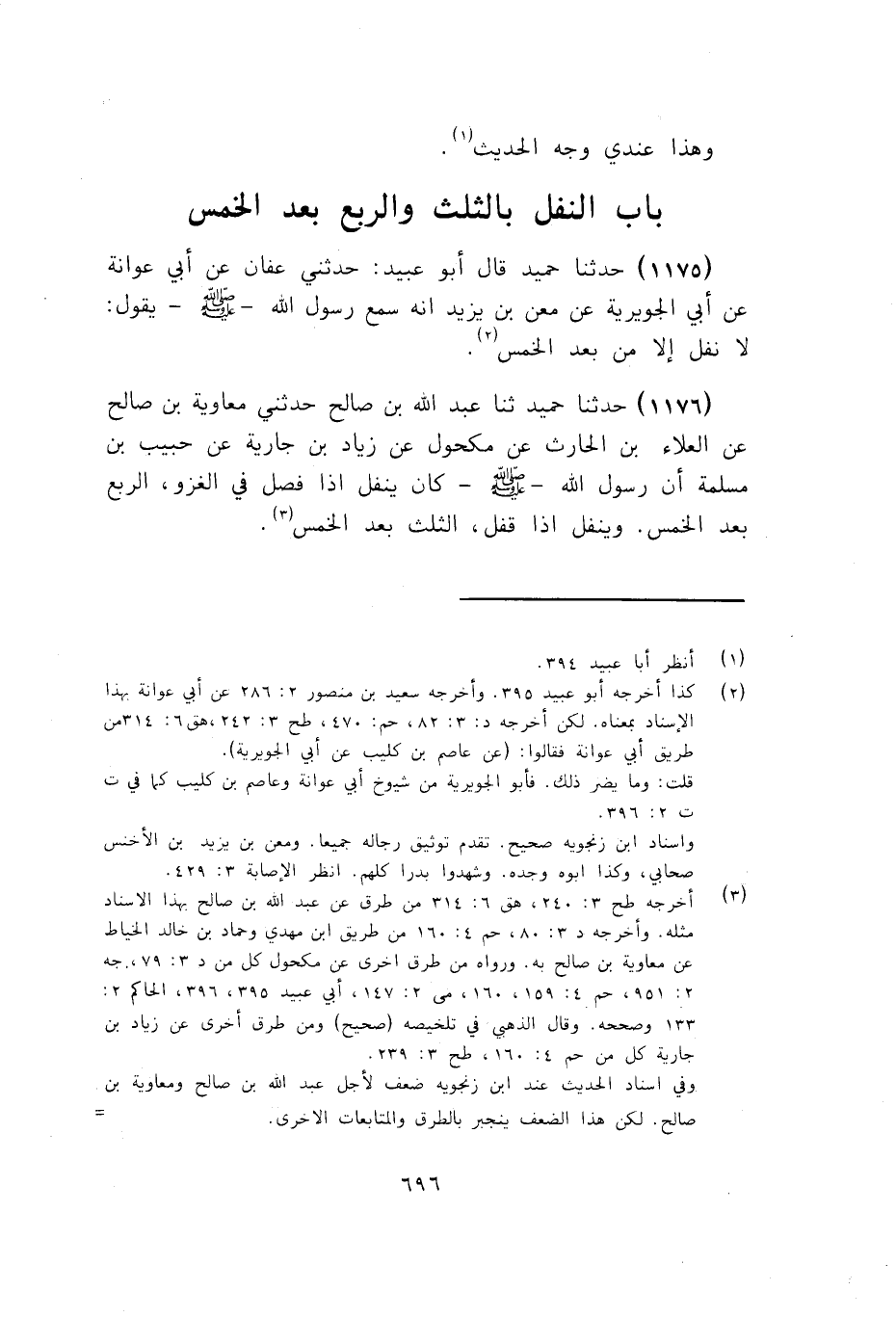 1176 - ثنا عَبْدُ اللَّهِ بْنُ صَالِحٍ، حَدَّثَنِي مُعَاوِيَةُ بْنُ صَالِحٍ، عَنِ الْعَلَاءِ بْنِ الْحَارِثِ، عَنْ مَكْحُولٍ، عَنْ زِيَادِ بْنِ جَارِيَةَ، عَنْ حَبِيبِ بْنِ مَسْلَمَةَ، أَنَّ رَسُولَ اللَّهِ صَلَّى اللهُ عَلَيْهِ وَسَلَّمَ كَانَ §يُنَفِّلُ إِذَا فَصَلَ فِي الْغَزْوِ، الرُّبُعَ بَعْدَ الْخُمُسِ، وَيُنَفِّلُ إِذَا قَفَلَ الثُّلُثَ بَعْدَ الْخُمُسِ "