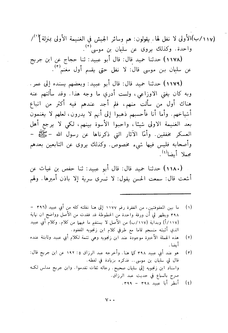 1179 - قَالَ أَبُو عُبَيْدٍ: وَبَعْضُهُمْ يُسْنِدُهُ إِلَى عُمَرَ وَبِهِ كَانَ يُفْتِي الْأَوْزَاعِيُّ، وَلَسْتُ أَدْرِي مَا وَجْهُ هَذَا وَقَدْ سَأَلْتَهُمْ عَنْهُ هُنَاكَ أَوَّلَ مَنْ سَأَلْتُ مِنْهُمْ، فَلَمْ أَجِدْ عِنْدَهُمْ فِيهِ أَكْثَرَ مِنَ اتِّبَاعِ أَشْيَاخِهِمْ وَأَمَّا أَنَا فَأَحْسَبُهُمْ ذَهَبُوا إِلَى أَنَّهُمْ لَا يَدْرُونَ، لَعَلَّهُمْ لَا يَغْنَمُونَ بَعْدَ الْغَنِيمَةِ الْأُولَى شَيْئًا، وَأَحَبُّوا الْأُسْوَةَ بَيْنَهُمْ لِكَيْ لَا يَرْجِعَ أَهْلُ الْعَسْكَرِ مُخْفِقِينَ وَأَمَّا الْآثَارُ الَّتِي ذَكَرْنَاهَا عَنْ رَسُولِ اللَّهِ صَلَّى اللهُ عَلَيْهِ وَسَلَّمَ وَأَصْحَابِهِ فَلَيْسَ فِيهَا شَيْءٌ مَخْصُوصٌ وَكَذَلِكَ يُرْوَى عَنِ التَّابِعِينَ بَعْدَهُمْ مُجْمَلًا أَيْضًا