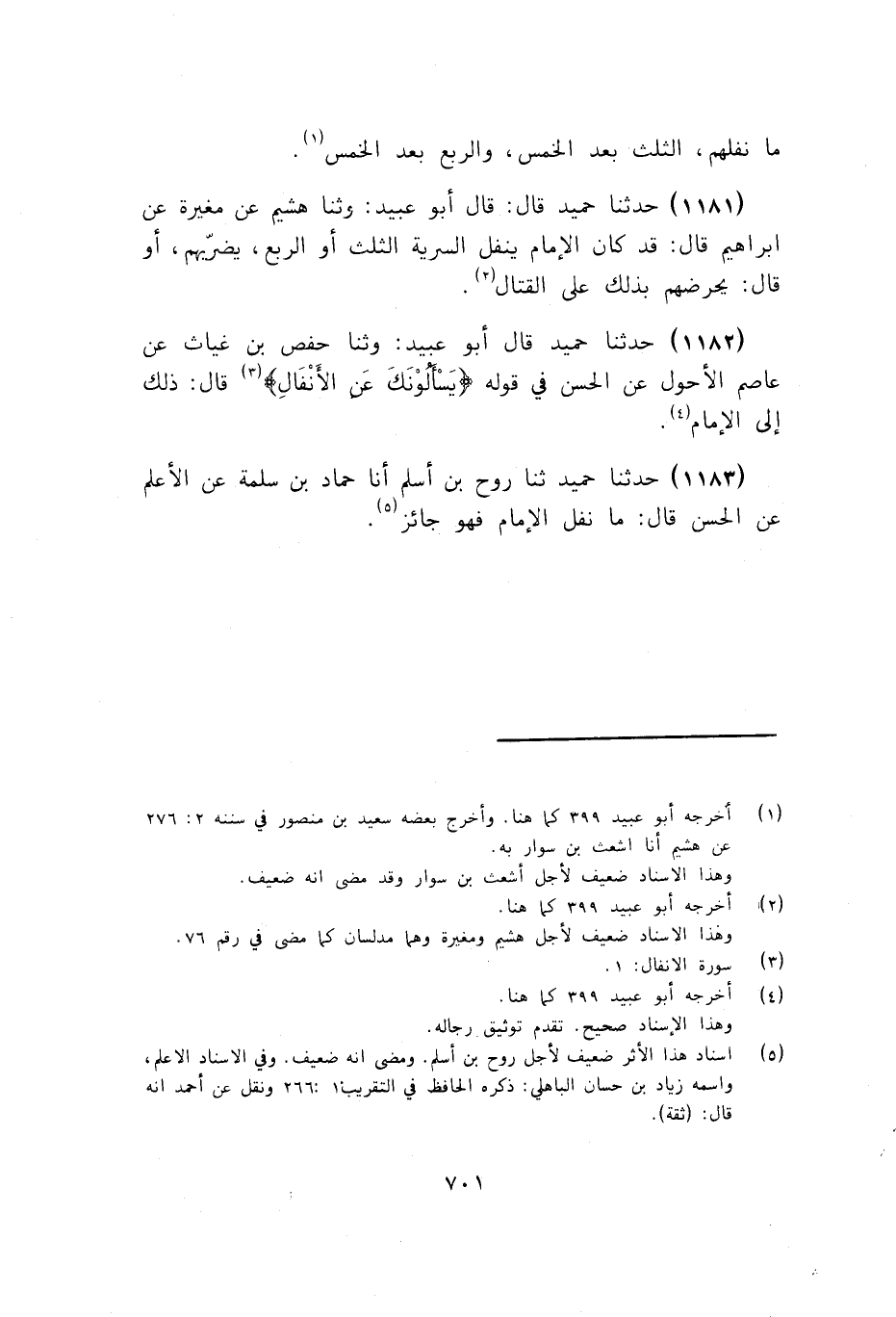 1181 - قَالَ أَبُو عُبَيْدٍ: وَثَنَا هُشَيْمٌ، عَنْ مُغِيرَةَ، عَنْ إِبْرَاهِيمَ قَالَ: " §قَدْ كَانَ الْإِمَامُ يُنَفِّلُ السَّرِيَّةَ الثُّلُثَ أَوِ الرُّبُعَ، يُضَرِّيهِمْ , أَوْ قَالَ: يُحَرِّضُهُمْ بِذَلِكَ عَلَى الْقِتَالِ "