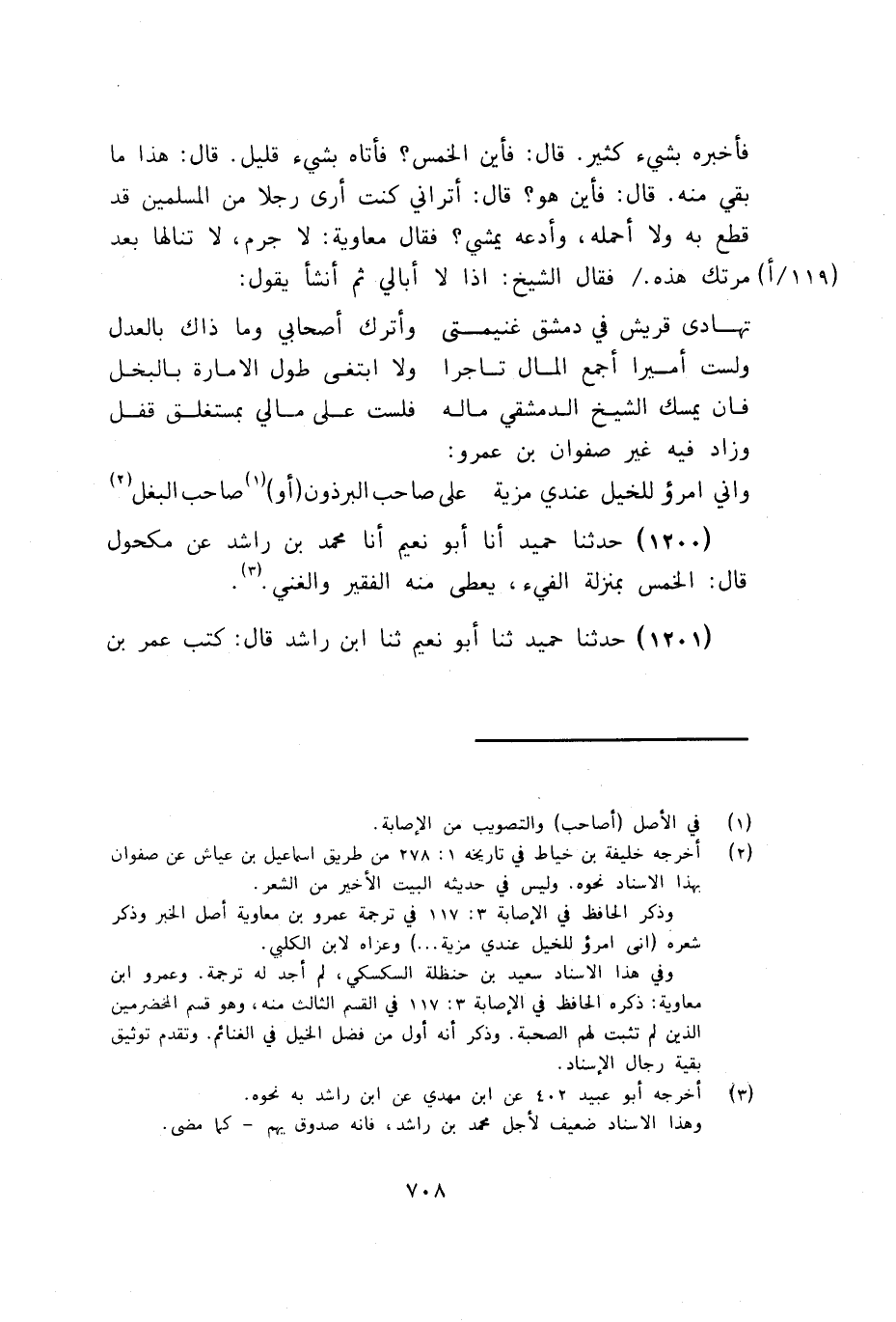 1201 - ثنا أَبُو نُعَيْمٍ، ثنا ابْنُ رَاشِدٍ، قَالَ: كَتَبَ عُمَرُ بْنُ -[709]- عَبْدِ الْعَزِيزِ بِذَلِكَ إِلَى أُمَرَاءِ الْأَجْنَادِ، أَنَّ «§سَبِيلَ الْخُمُسِ سَبِيلُ عَامَّةِ الْفَيْءِ»