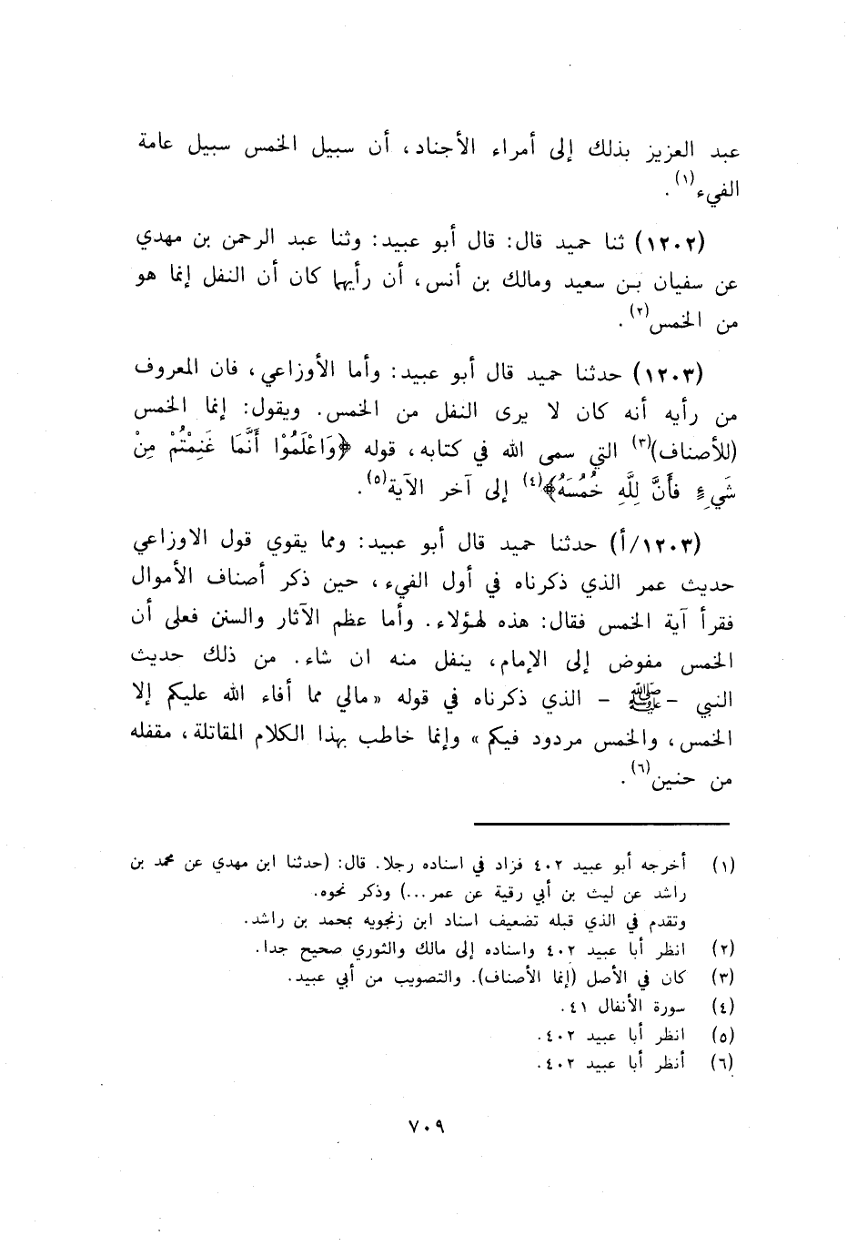 1203 - قَالَ أَبُو عُبَيْدٍ: وَأَمَا الْأَوْزَاعِيُّ، فَإِنَّ الْمَعْرُوفَ مِنْ رَأْيِهِ أَنَّهُ كَانَ لَا يَرَى النَّفَلَ مِنَ الْخُمُسِ وَيَقُولُ: إِنَّمَا الْخُمُسُ لِلْأَصْنَافِ الَّتِي سَمَّى اللَّهُ فِي كِتَابِهِ، قَوْلِهِ: {وَاعْلَمُوا أَنَّمَا غَنِمْتُمْ مِنْ شَيْءٍ فَأَنَّ لِلَّهِ خُمُسَهُ} [الأنفال: 41] إِلَى آخِرِ الْآيَةِ. حَدَّثَنَا حُمَيْدٌ قَالَ أَبُو عُبَيْدٍ: وَمِمَّا يُقَوِّي قَوْلَ الْأَوْزَاعِيِّ حَدِيثُ عُمَرَ الَّذِي ذَكَرْنَاهُ فِي أَوَّلِ الْفَيْءِ، حِينَ ذَكَرَ أَصْنَافَ الْأَمْوَالِ فَقَرَأَ آيَةَ الْخُمُسِ فَقَالَ: هَذِهِ لِهَؤُلَاءِ وَأَمَّا عِظَمُ الْآثَارِ وَالسُّنَنِ فَعَلَى أَنَّ الْخُمُسَ مُفَوَّضٌ مِنَ الْإِمَامِ يُنَفِّلُ مِنْهُ إِنْ شَاءَ وَمِنْ ذَلِكَ حَدِيثُ النَّبِيِّ صَلَّى اللهُ عَلَيْهِ وَسَلَّمَ الَّذِي ذَكَرْنَاهُ فِي قَوْلِهِ «مَالِي مِمَّا أَفَاءَ اللَّهُ عَلَيْكُمْ إِلَّا الْخُمُسَ، وَالْخُمُسُ مَرْدُودٌ فِيكُمْ» وَإِنَّمَا خَاطَبَ بِهَذَا الْكَلَامِ الْمُقَاتِلَةَ , مَقْفَلَهُ مِنْ حُنَيْنٍ