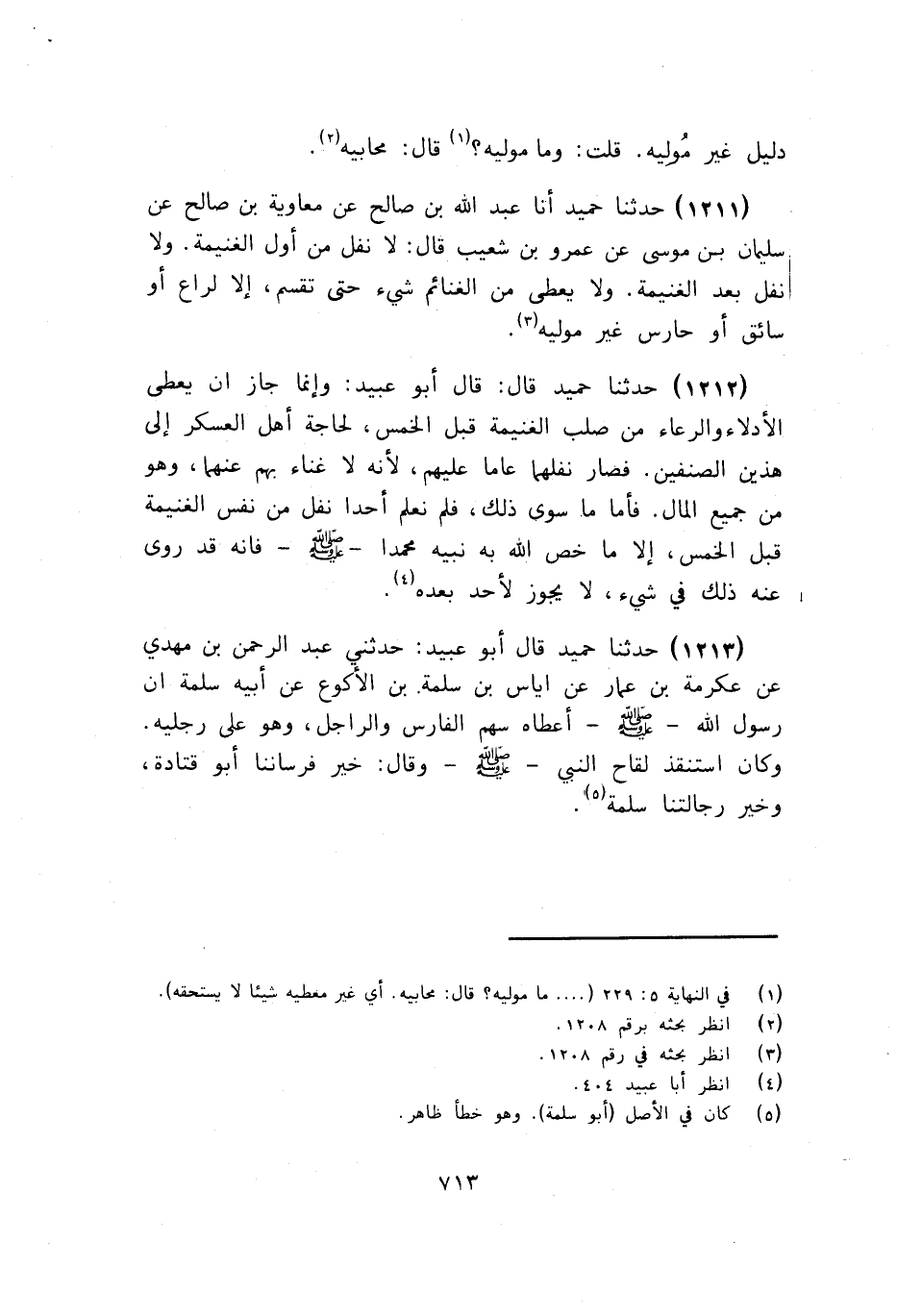 1214 - قَالَ أَبُو عُبَيْدٍ: يَذْهَبُ سُفْيَانُ إِلَى أَنَّ النُّقْصَانَ، فِي السِّهَامِ، وَالنَّفَلَ مِنَ الْغَنِيمَةِ، لَيْسَ لِأَحَدٍ بَعْدَ النَّبِيِّ صَلَّى اللهُ عَلَيْهِ وَسَلَّمَ وَكَانَ رَأْيُهُ أَنَّ النَّفَلَ إِنَّمَا يَكُونُ مِنَ الْخُمُسِ نَفْسِهِ بَعْدَ أَنْ يُعْزَلَ يَقُولُ: فَكَانَ مَا آثَرَ بِهِ رَسُولُ اللَّهِ صَلَّى اللهُ عَلَيْهِ وَسَلَّمَ سَلَمَةَ خَاصًّا لَهُ، لَا يَكُونُ لِأَحَدٍ بَعْدَهُ. حَدَّثَنَا حُمَيْدٌ