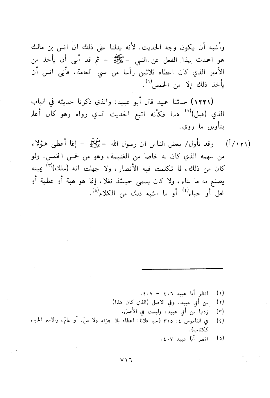 1224 - قَالَ أَبُو عُبَيْدٍ: وَأَنَا سَعِيدُ بْنُ عُفَيْرٍ، عَنْ عَبْدِ اللَّهِ بْنِ لَهِيعَةَ، عَنْ عُبَيْدِ اللَّهِ بْنِ أَبِي جَعْفَرٍ، عَنْ نَافِعٍ، عَنِ ابْنِ عُمَرَ، قَالَ: «§رَأَيْتُ الْمَغَانِمَ تُجَزَّأُ خَمْسَةَ أَجْزَاءٍ، ثُمَّ يُسْهَمُ عَلَيْهَا، فَمَا صَارَ لِرَسُولِ اللَّهِ فَهُوَ لَهُ لَا يُخْتَارُ»