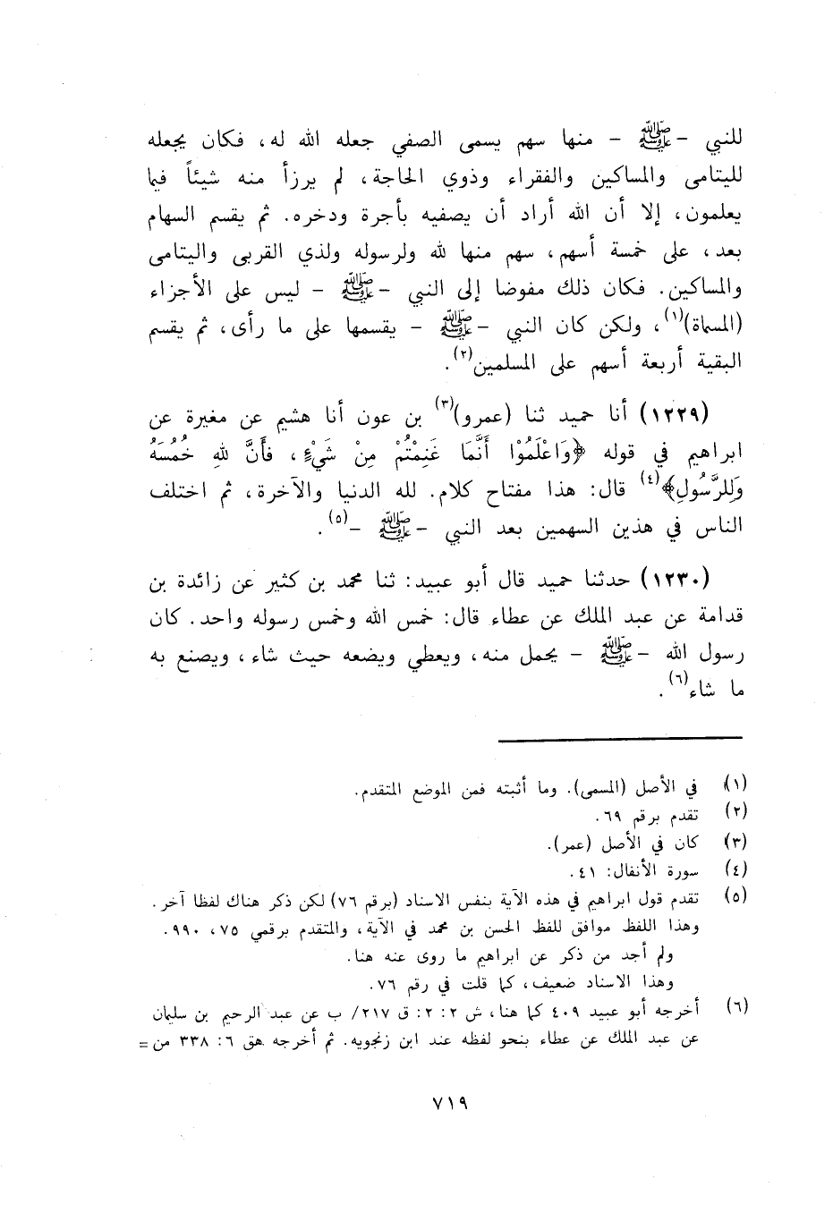 1229 - ثنا عَمْرُو بْنُ عَوْنٍ، أنا هُشَيْمٌ، عَنْ مُغِيرَةَ، عَنْ إِبْرَاهِيمَ، فِي قَوْلِهِ: {§وَاعْلَمُوا أَنَّمَا غَنِمْتُمْ مِنْ شَيْءٍ فَأَنَّ لِلَّهِ خُمُسَهُ وَلِلرَّسُولِ} [الأنفال: 41] قَالَ: هَذَا مِفْتَاحُ كَلَامٍ , لِلَّهِ الدُّنْيَا وَالْآخِرَةُ، ثُمَّ اخْتَلَفَ النَّاسُ فِي هَذَيْنِ السَّهْمَيْنِ بَعْدَ النَّبِيِّ صَلَّى اللهُ عَلَيْهِ وَسَلَّمَ "