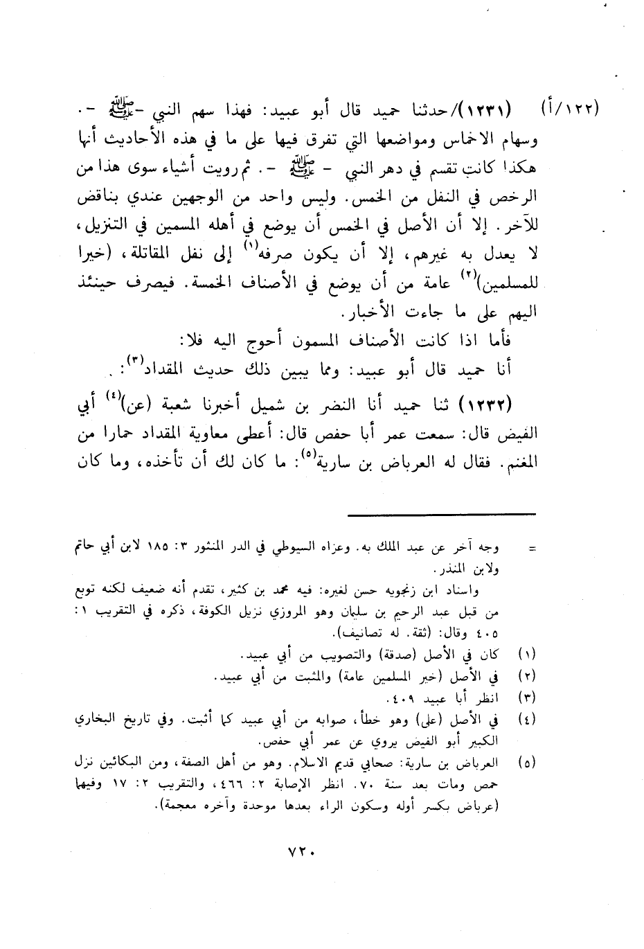 1232 - أَنَا حُمَيْدٌ أنا النَّضْرُ بْنُ شُمَيْلٍ، أَخْبَرَنَا شُعْبَةُ، عَنْ أَبِي الْفَيْضِ، قَالَ: سَمِعْتُ عُمَرَ أَبَا حَفْصٍ، قَالَ: §أَعْطَى مُعَاوِيَةُ الْمِقْدَادَ حِمَارًا مِنَ الْمَغْنَمِ، فَقَالَ لَهُ الْعِرْبَاضُ بْنُ سَارِيَةَ: مَا كَانَ لَكَ أَنْ تَأْخُذَهُ، وَمَا كَانَ -[721]- لِمُعَاوِيَةَ أَنْ يُعْطِيَكَهُ، كَأَنِّي بِكَ فِي النَّارِ تَحْمِلُهُ عَلَى عُنُقِكَ، أَسْفَلُهُ أَعْلَاهُ قَالَ: «فَرَدَّهُ»