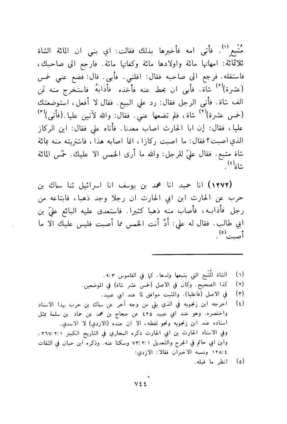 1273 - قَالَ أَبُو عُبَيْدٍ: أَفَلَا تَرَى عَلِيًّا قَدْ سَمَّى الْمَعْدِنَ رِكَازًا، وَحَكَمَ عَلَيْهِ بِحُكْمِهِ، فَأَخَذَ مِنْهُ الْخُمُسَ وَكَذَلِكَ كَانَ رَأْيُ الزُّهْرِيِّ، وَهُوَ يُحَدِّثُ عَنِ النَّبِيِّ صَلَّى اللهُ عَلَيْهِ وَسَلَّمَ بِحَدِيثِ الرِّكَازِ: أَنَّ فِيهِ الْخُمُسَ