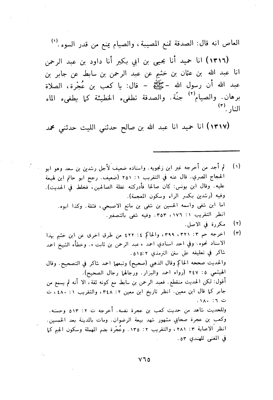 1316 - أَنَا حُمَيْدٌ أنا يَحْيَى بْنُ أَبِي بَكْرٍ، أنا دَاوُدُ بْنُ عَبْدِ الرَّحْمَنِ، أنا عَبْدُ اللَّهِ بْنُ عُثْمَانَ بْنِ خُثَيْمٍ، عَنْ عَبْدِ الرَّحْمَنِ بْنِ سَابِطٍ، عَنْ جَابِرِ بْنِ عَبْدِ اللَّهِ، أَنَّ رَسُولَ اللَّهِ صَلَّى اللهُ عَلَيْهِ وَسَلَّمَ قَالَ: «يَا كَعْبُ بْنَ عُجْرَةَ، §الصَّلَاةُ بُرْهَانٌ , وَالصِّيَامُ جُنَّةٌ، وَالصَّدَقَةُ تُطْفِئُ الْخَطِيئَةَ كَمَا يُطْفِئُ الْمَاءُ النَّارَ»