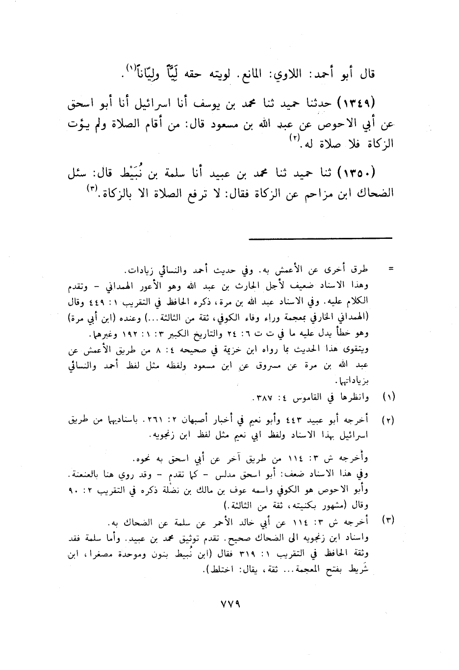 1350 - ثَنَا حُمَيْدٌ ثنا مُحَمَّدُ بْنُ عُبَيْدٍ، أنا سَلَمَةُ بْنُ نُبَيْطٍ، قَالَ: سُئِلَ الضَّحَّاكُ بْنُ مُزَاحِمٍ عَنِ الزَّكَاةِ، فَقَالَ: «§لَا تُرْفَعُ الصَّلَاةِ إِلَّا بِالزَّكَاةِ»