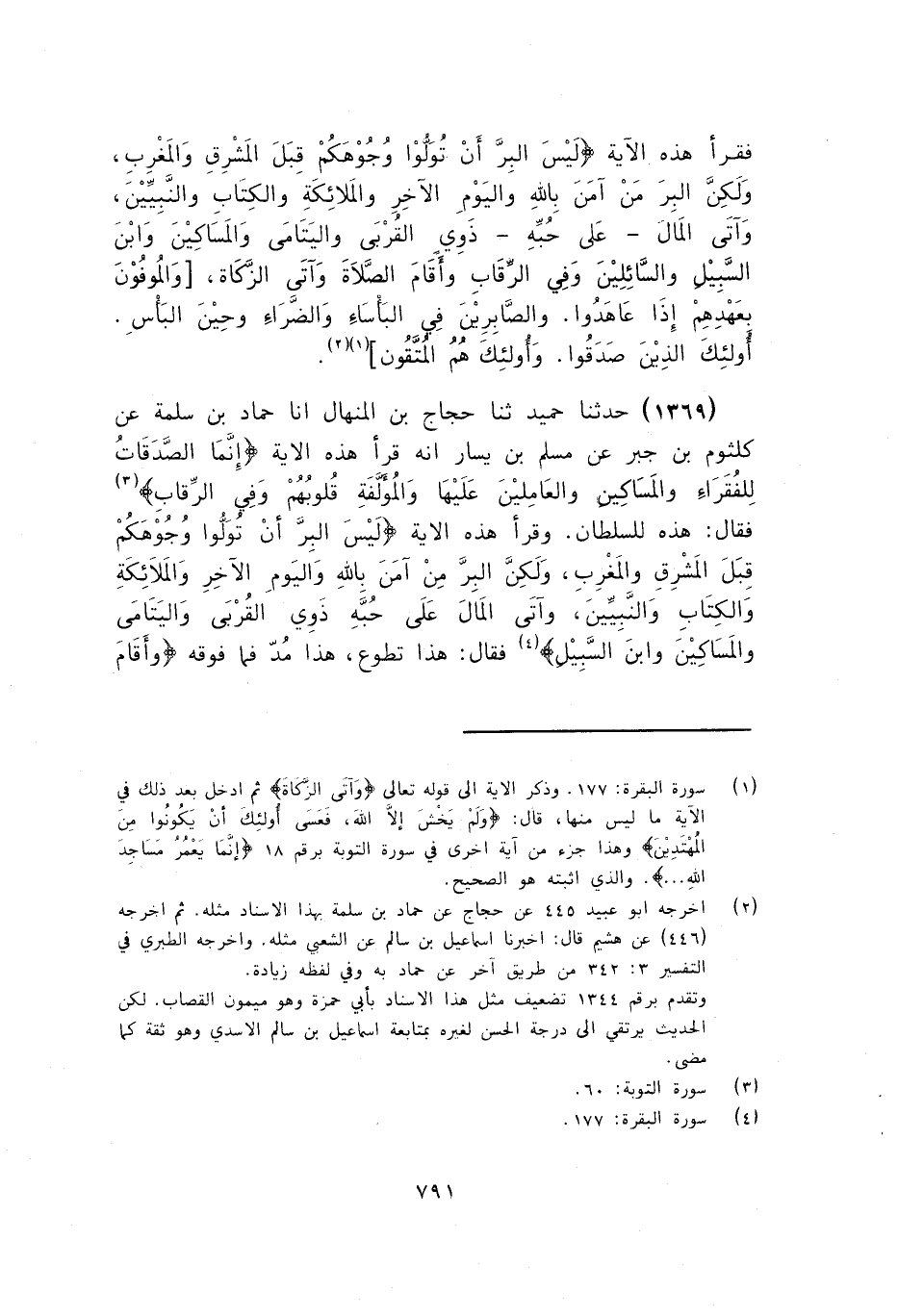 1369 - ثنا حَجَّاجُ بْنُ الْمِنْهَالِ، أنا حَمَّادُ بْنُ سَلَمَةَ، عَنْ كُلْثُومِ بْنِ جَبْرٍ، عَنْ مُسْلِمِ بْنِ يَسَارٍ، أَنَّهُ قَرَأَ هَذِهِ الْآيَةَ: {إِنَّمَا الصَّدَقَاتُ لِلْفُقَرَاءِ وَالْمَسَاكِينِ وَالْعَامِلِينَ عَلَيْهَا وَالْمُؤَلَّفَةِ قُلُوبُهُمْ وَفِي الرِّقَابِ} [التوبة: 60] , فَقَالَ: «§هَذِهِ لِلسُّلْطَانِ» وَقَرَأَ هَذِهِ الْآيَةَ: {لَيْسَ الْبِرَّ أَنْ تُوَلُّوا وُجُوهَكُمْ قِبَلَ الْمَشْرِقِ وَالْمَغْرِبِ وَلَكِنَّ الْبِرَّ مَنْ آمَنَ بِاللَّهِ وَالْيَوْمِ الْآخِرِ وَالْمَلَائِكَةِ وَالْكِتَابِ وَالنَّبِيِّينَ وَآتَى الْمَالَ عَلَى حُبِّهِ ذَوِي الْقُرْبَى وَالْيَتَامَى وَالْمَسَاكِينَ وَابْنَ السَّبِيلِ} [البقرة: 177] ، فَقَالَ: «هَذَا تَطَوَّعٌ، هَذَا مُدٌّ فَمَا فَوْقَهُ» {وَأَقَامَ -[792]- الصَّلَاةَ وَآتَى الزَّكَاةَ} [البقرة: 177] فَقَالَ: «هَذَا لِلسُّلْطَانِ»