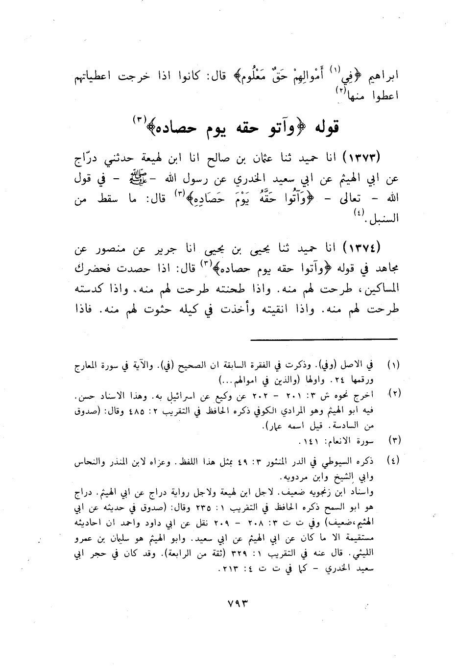 1373 - ثنا عُثْمَانُ بْنُ صَالِحٍ، أنا ابْنُ لَهِيعَةَ، حَدَّثَنِي دَرَّاجٍ، عَنْ أَبِي الْهَيْثَمِ، عَنْ أَبِي سَعِيدٍ الْخُدْرِيِّ، عَنْ رَسُولِ اللَّهِ صَلَّى اللهُ عَلَيْهِ وَسَلَّمَ فِي قَوْلِ اللَّهِ تَعَالَى: {§وَآتُوا حَقَّهُ يَوْمَ حَصَادِهِ} [الأنعام: 141] قَالَ: «مَا سَقَطَ مِنَ السُّنْبُلِ»