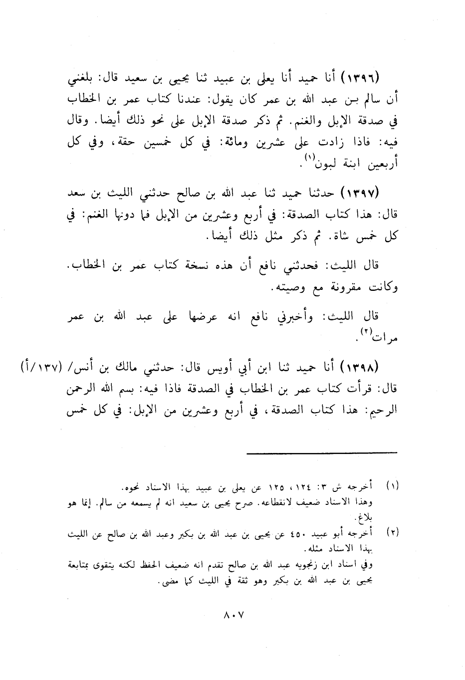 1397 - ثنا عَبْدُ اللَّهِ بْنُ صَالِحٍ، حَدَّثَنِي اللَّيْثُ بْنُ سَعْدٍ، قَالَ: هَذَا كِتَابُ الصَّدَقَةِ: " §فِي أَرْبَعٍ وَعِشْرِينَ مِنَ الْإِبِلِ فَمَا دُونَهَا الْغَنَمُ: فِي كُلِّ خَمْسٍ شَاةٌ " ثُمَّ ذَكَرَ مِثْلَ ذَلِكَ أَيْضًا قَالَ اللَّيْثُ: فَحَدَّثَنِي نَافِعٌ أَنَّ هَذِهِ نُسْخَةُ كِتَابِ عُمَرَ بْنِ الْخَطَّابِ، وَكَانَتْ مَقْرُونَةً مَعَ وَصِيَّتِهِ قَالَ اللَّيْثُ: وَأَخْبَرَنِي نَافِعٌ أَنْهَ عَرَضَهَا عَلَى عَبْدِ اللَّهِ بْنِ عُمَرَ مَرَّاتٍ