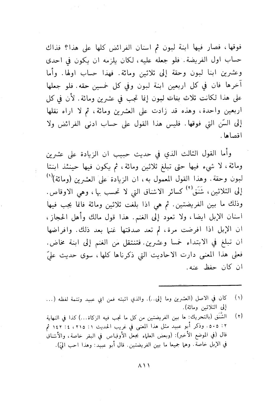 1408 - قَالَ أَبُو عُبَيْدٍ: فَفِي هَذِهِ الْأَحَادِيثِ الْمَعْنَيَانِ جَمِيعًا -[813]-: إِحْدَاهُمَا: أَنَّ الْإِبِلَ لَا تَعُودُ إِلَى الْغَنَمِ بَعْدَ عِشْرِينَ وَمِائَةٍ، أَلَا تَرَاهُ لَمْ يُعِدْ ذِكْرَهَا؟ وَالْآخَرُ: أَنَّهُ لَيْسَ فِي الْأَشْنَاقِ شَيْءٌ، لِقَوْلِهِ «فِي كُلِّ أَرْبَعِينَ ابْنَةُ لَبُونٍ، وَفِي كُلِّ خَمْسِينَ حِقَّةٌ» وَسَكَتَ عَمَّا بَيْنَهُمَا، مَعَ إِنَّهُ مَحْسُوبٌ مُفَسَّرٌ إِلَى ثَلَاثِمِائَةٍ، فِي حَدِيثِ حَبِيبِ بْنِ أَبِي حَبِيبٍ الَّذِي ذَكَرْنَاهُ. حَدَّثَنَا حُمَيْدٌ قَالَ أَبُو عُبَيْدٍ: فَهَذَا مَا جَاءَ فِي فَرَائِضِ الْإِبِلِ، إِذَا كَانَتْ هَذِهِ الْأَسْنَانُ مَوْجُودَةٌ عِنْدَ أَرْبَابِهَا، فَأَمَّا إِذَا كَانَتْ مَعْدُومَةً وَاحْتَاجَ الْمُصَدِّقُ إِلَى أَخْذِ غَيْرَ الَّتِي وَجَبَتْ لَهُ فَإِنَّ الْقَوْلَ فِيهَا غَيْرُ ذَلِكَ , وَقَدْ جَاءَتْ بِهِ الْآثَارُ