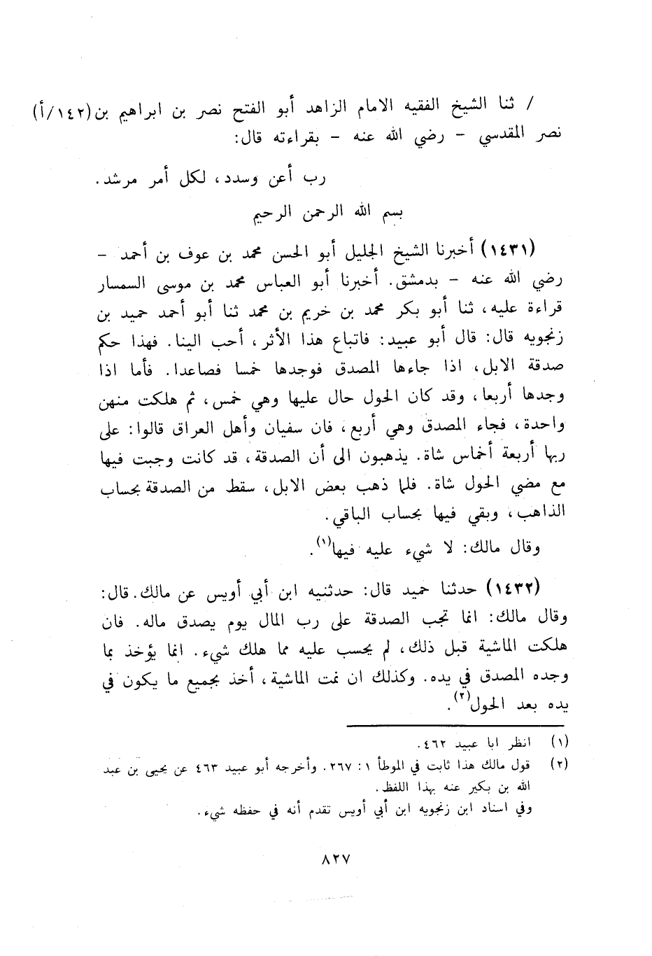 1433 - قَالَ أَبُو عُبَيْدٍ: وَقَوْلُ مَالِكٍ هَذَا أَشْبَهُ عِنْدِي بِسُنَّةِ الصَّدَقَةِ؛ لِأَنَّهَا إِنَّمَا جَاءَتْ مُطْلَقَةً، فِي كَذَا وَكَذَا مِنَ الْإِبِلِ كَذَا وَكَذَا، فَهَذَا إِنَّمَا يَقَعُ مَعْنَاهُ عَلَى مَا كَانَ مَوْجُودًا فِي أَيْدِيهِمْ، وَلَمْ يَأْتِ فِي شَيْءٍ مِنْ كُتُبِ الصَّدَقَةِ - أَنَّ أَهْلَ الْمَاشِيَةِ يُحَاسَبُونَ بِمَا كَانُوا يَمْلِكُونَهُ قَبْلَ ذَلِكَ ثُمَّ هَلَكَ، وَلَا يُسْأَلُونَ عَمَّا ضَاعَ مِنْهَا وَأَمَّا الَّذِي ذَهَبَ إِلَيْهِ أَهْلُ الْعِرَاقِ، فَإِنَّهُمْ أَنْزَلُوا الصَّدَقَةَ بِمَنْزِلَةِ الدَّيْنِ إِذَا حَالَ الْحَوْلُ عَلَى الْمَالِ، وَلَوْ كَانَتِ الصَّدَقَةُ تَحِلُّ مَحَلَّ الدَّيْنِ، لَكَانْ يَنْبَغِي أَنْ تَجِبَ عَلَى رَبِّ الْمَاشِيَةِ فِي هَذِهِ الْخَمْسِ الَّتِي هَلَكَتْ إِحْدَاهُنَّ، الشَّاةُ كُلُّهَا، وَكَذَلِكَ لَوْ هَلَكَتْ إِبِلُهُ مِنْ عِنْدِ آخِرِهَا؛ لِأَنَّهُ لَا يُسْقِطُ هَلَاكُهَا عَنْهُ دَيْنًا، قَدْ لَزِمَهُ مَرَّةً وَلَيْسَ الْأَمْرُ عِنْدَنَا فِيهَا إِلَّا عَلَى مَا قَالَ مَالِكٌ، لِمُوَافَقَتِهِ تَأْوِيلَ الْآثَارِ وَالسُّنَّةِ، فَإِنْ لَمْ يَكُنْ ضَاعَ مِنْ هَذِهِ الْخَمْسِ شَيْءٌ، وَلَكِنْ حَالَ عَلَيْهَا حَوْلَانِ اثْنَانِ وَهِيَ خَمْسٌ تَامَّةٌ، ثُمَّ جَاءَ الْمُصَدِّقُ، فَإِنَّ سُفْيَانَ يَرْوِي عَنْهُ أَنَّهُ قَالَ: عَلَيْهِ فِيهَا شَاةٌ وَاحِدَةٌ لِلسَّنَةِ الْأُولَى وَلَيْسَ عَلَيْهِ فِي السَّنَةِ الثَّانِيَةِ شَيْءٌ، وَقَالَ مَالِكٌ: عَلَيْهِ شَاتَانِ، لِكُلِّ سَنَةٍ وَاحِدَةٌ. حَدَّثَنَا حُمَيْدٌ