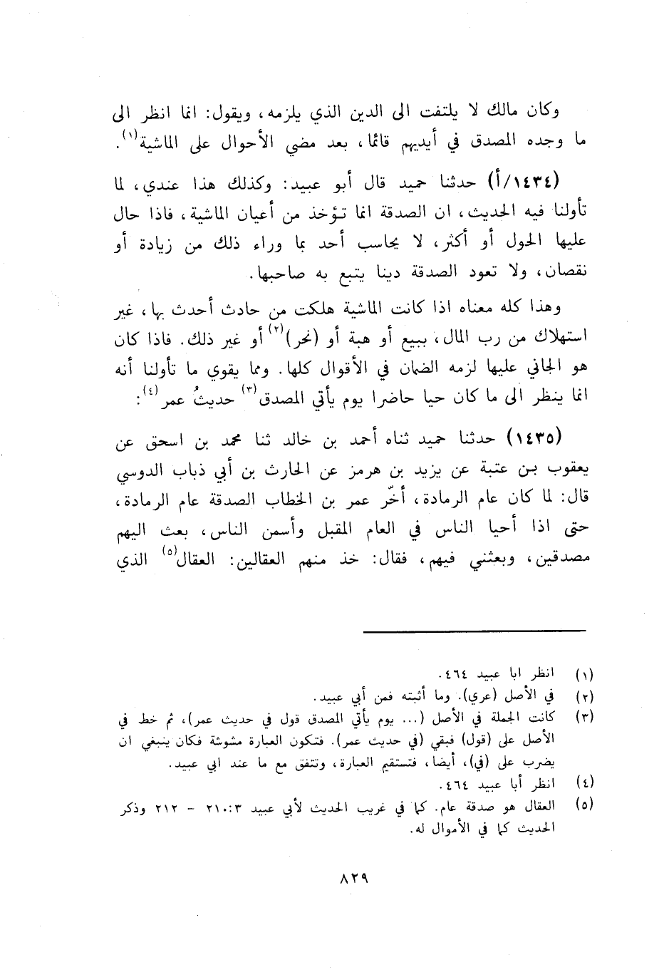 1436 - قَالَ أَبُو عُبَيْدٍ: أَلَا تَرَى أَنَّ عُمَرَ، قَدْ أَخَذَهُمْ بِصَدَقَةِ عَامَيْنِ، وَهُوَ يَعْلَمُ أَنَّ فِيَ مِثْلِ هَذِهِ الْمُدَّةِ وَأَقَلَّ مِنْهَا مَا تَكُونُ الْحَوَادِثُ بِالْمَاشِيَةِ فِي الزِّيَادَةِ وَالنُّقْصَانِ، فَلَمْ يَشْتَرِطْ عَلَيْهِمْ أَنْ يُحَاسَبُوا بِشَيْءٍ مِمَّا تَلَفَ؟ وَمِنْهُ الْحَدِيثُ الْمَرْفُوعُ:
