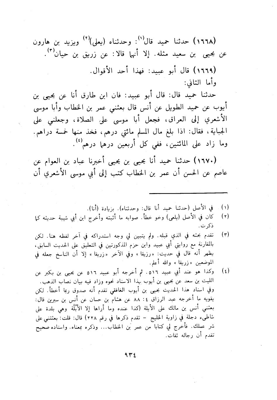 وَأَمَّا الثَّانِي حَدَّثَنَا حُمَيْدٌ قَالَ أَبُو عُبَيْدٍ: فَإِنَّ ابْنَ طَارِقٍ أنا، عَنْ يَحْيَى بْنِ أَيُّوبَ، عَنْ حُمَيْدٍ الطَّوِيلِ، عَنْ أَنَسٍ، قَالَ: بَعَثَنِي عُمَرُ بْنُ الْخَطَّابِ وَأَبَا مُوسَى الْأَشْعَرِيَّ إِلَى الْعِرَاقِ , فَجَعَلَ أَبَا مُوسَى عَلَى الصَّلَاةِ , وَجَعَلَنِي عَلَى الْجِبَايَةِ فَقَالَ: «§إِذَا بَلَغَ مَالُ الْمُسْلِمِ مِائَتَيْ دِرْهَمٍ , فَخُذْ مِنْهَا خَمْسَةَ دَرَاهِمَ , وَمَا زَادَ عَلَى الْمِائَتَيْنِ فَفِي كُلِّ أَرْبَعِينَ دِرْهَمًا دِرْهَمٌ»