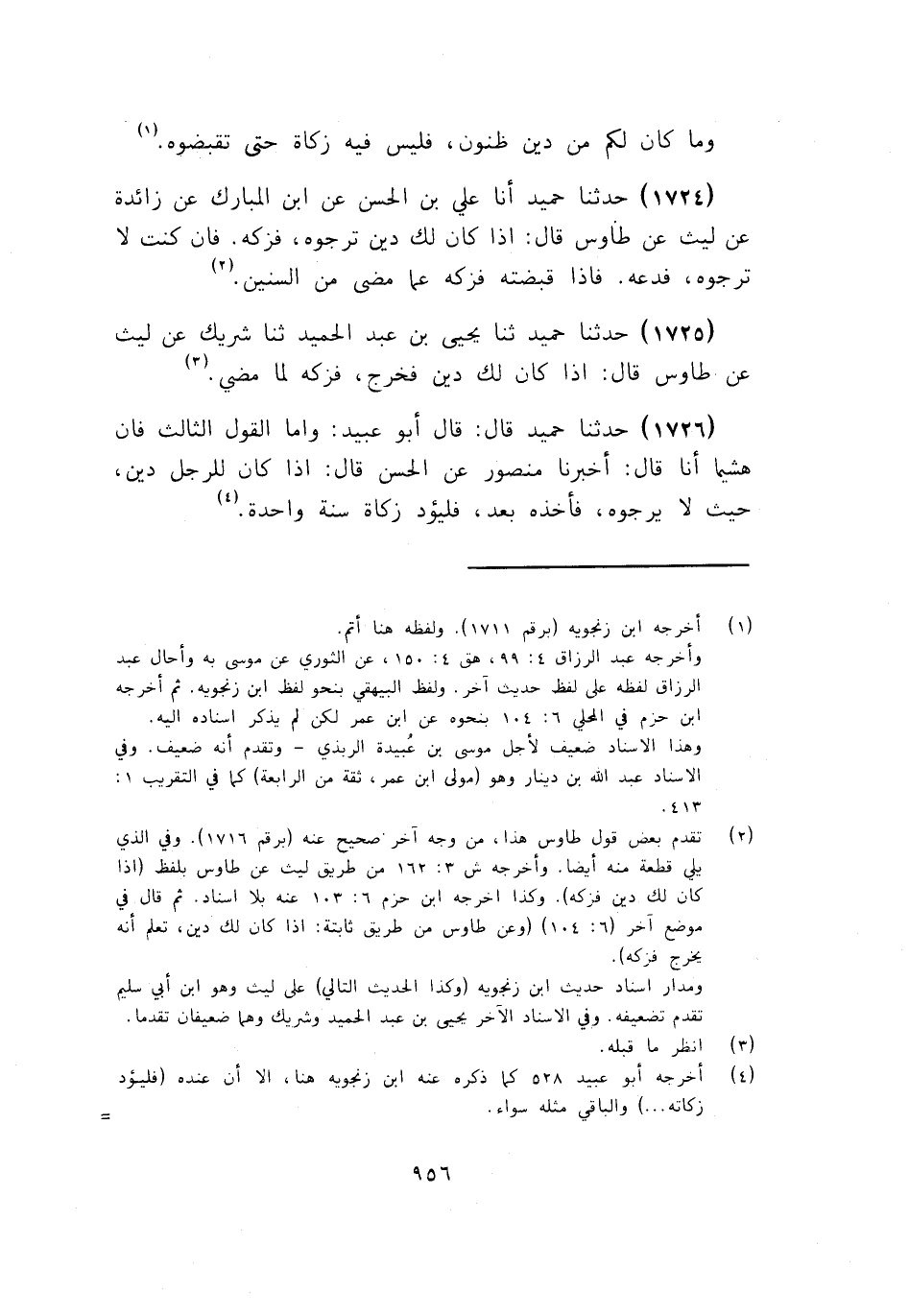 1724 - أنا عَلِيُّ بْنُ الْحَسَنِ، عَنِ ابْنِ الْمُبَارَكِ، عَنْ زَائِدَةَ، عَنْ لَيْثٍ، عَنْ طَاوُسٍ قَالَ: «§إِذَا كَانَ لَكَ دَيْنٌ تَرْجُوهُ فَزَكِّهِ , فَإِنْ كُنْتَ لَا تَرْجُوهُ فَدَعْهُ , فَإِذَا قَبَضْتَهُ فَزَكِّهِ عَمَّا مَضَى مِنَ السِّنِينَ»