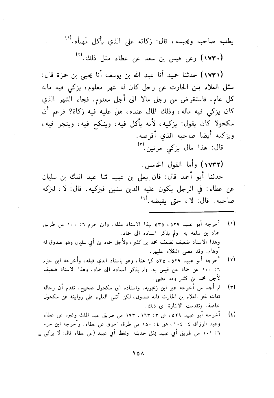 1731 - أنا عَبْدُ اللَّهِ بْنُ يُوسُفَ، أنا يَحْيَى بْنُ حَمْزَةَ، قَالَ: سُئِلَ الْعَلَاءُ بْنُ الْحَارِثِ " عَنْ §رَجُلٍ كَانَ لَهُ شَهْرٌ مَعْلُومٌ يُزَكِّي فِيهِ مَالَهُ كُلَّ عَامٍ , فَاسْتَقْرَضَ مِنْ رَجُلٍ مَالًا إِلَى أَجْلٍ مَعْلُومٍ , فَجَاءَ الشَّهْرُ الَّذِي كَانَ يُزَكِّي فِيهِ مَالَهُ , وَذَلِكَ الْمَالُ عِنْدَهُ , هَلْ عَلَيْهِ فِيهِ زَكَاةٌ؟ فَزَعَمَ أَنَّ مَكْحُولًا كَانَ يَقُولُ: يُزَكِّيهِ , لِأَنَّهُ يَأْكُلُ فِيهِ , وَيَنْكِحُ فِيهِ , وَيَتَّجِرُ فِيهِ , وَيُزَكِّيهِ أَيْضًا صَاحِبُهُ الَّذِي أَقْرَضَهُ قَالَ: هَذَا مَالٌ يُزَكَّى مَرَّتَيْنِ