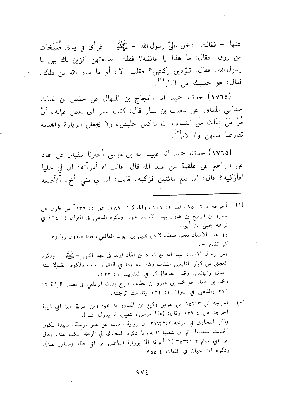 1764 - أنا الْحَجَّاجُ بْنُ الْمِنْهَالِ، عَنْ حَفْصِ بْنِ غِيَاثٍ، حَدَّثَنِي الْمُسَاوِرُ، عَنْ شُعَيْبِ بْنِ يَسَارٍ، قَالَ: كَتَبَ عُمَرُ إِلَى بَعْضِ عُمَّالِهِ: أَنَّ §مُرْ مَنْ قِبَلَكَ مِنَ النِّسَاءِ أَنَّ يُزَكِّينَ حُلِيَّهُنَّ , وَلَا يَجْعَلْنَ الزِّيَارَةَ وَالْهَدِيَّةَ تَقَارُضًا بَيْنَهُنَّ، وَالسَّلَامُ "