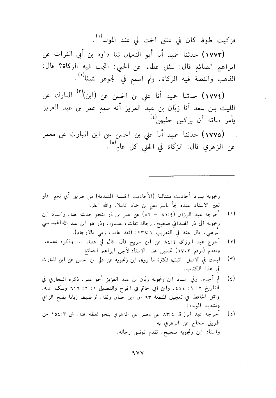 1774 - أنا عَلِيُّ بْنُ الْحَسَنِ، عَنِ ابْنِ الْمُبَارَكِ، عَنِ اللَّيْثِ بْنِ سَعْدٍ، أنا زَبَّانُ بْنُ عَبْدِ الْعَزِيزِ، أَنَّهُ سَمِعَ عُمَرَ بْنَ عَبْدِ الْعَزِيزِ: «§يَأْمُرُ بَنَاتِهِ أَنْ يُزَكِّينَ حُلِيَّهُنَّ»