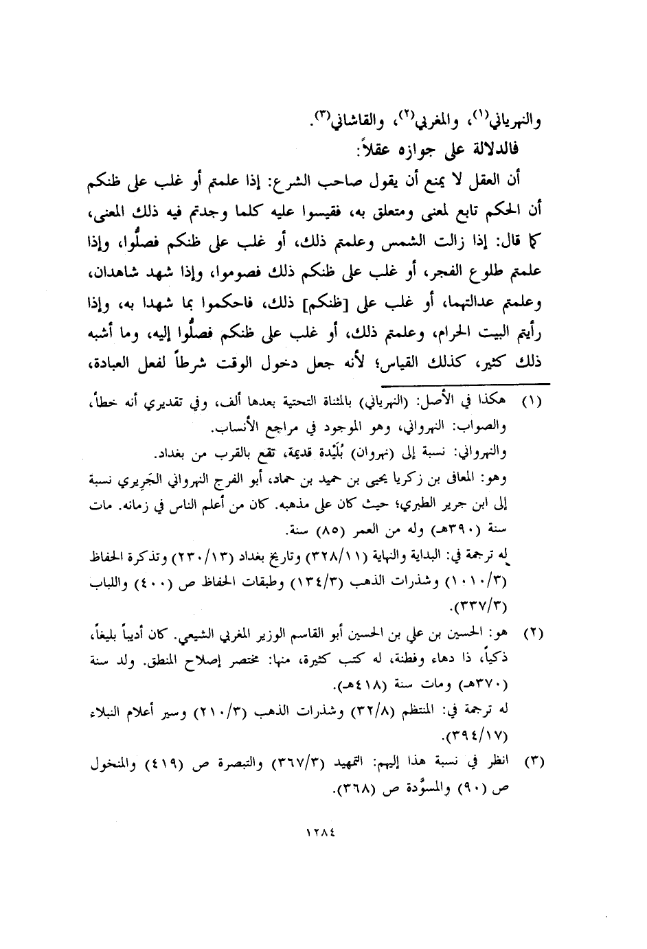 أن العقل لا يمنع أن يقول صاحب الشرع: إذا علمتم أو غلب على ظنكم أن الحكم تابع لمعنى ومتعلق به، فقيسوا عليه كلما وجدتم فيه ذلك المعنى، كما قال: إذا زالت الشمس وعلمتم ذلك، أو غلب على ظنكم فصلُّوا، وإذا علمتم طلوع الفجر، أو غلب على ظنكم ذلك فصوموا، وإذا شهد شاهدان، وعلمتم عدالتهما، أو غلب على [ظنكم] ذلك، فاحكموا بما شهدا به، وإذا رأيتم البيت الحرام، وعلمتم ذلك، أو غلب على ظنكم فصلوا إليه، وما أشبه ذلك كثير، كذلك القياس؛ لأنه جعل دخول الوقت شرطاً لفعل العبادة،