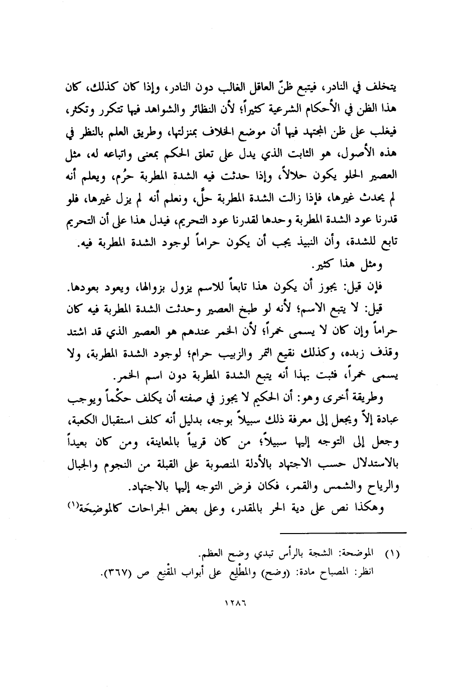يتخلف في النادر، فيتبع ظنّ العاقل الغالب دون النادر، وإذا كان كذلك، كان هذا الظن في الأحكام الشرعية كثيراً؛ لأن النظائر والشواهد فيها تتكرر وتكثر، فيغلب على ظن المجتهد فيها أن موضع الخلاف بمنزلتها، وطريق العلم بالنظر في هذه الأصول، هو الثابت الذى يدل على تعلق الحكم بمعنى واتباعه له، مثل العصير الحلو يكون حلالاً، وإذا حدثت فيه الشدة المطربة حرُم، ويعلم أنه لم يحدث غيرها، فإذا زالت الشدة المطربة حل، ونعلم أنه لم يزل غيرها، فلو قدرنا عود الشدة المطربة وحدها لقدرنا عود التحريم، فيدل هذا على أن التحريم تابع للشدة، وأن النبيذ يجب أن يكون حراماً لوجود الشدة المطربة فيه.