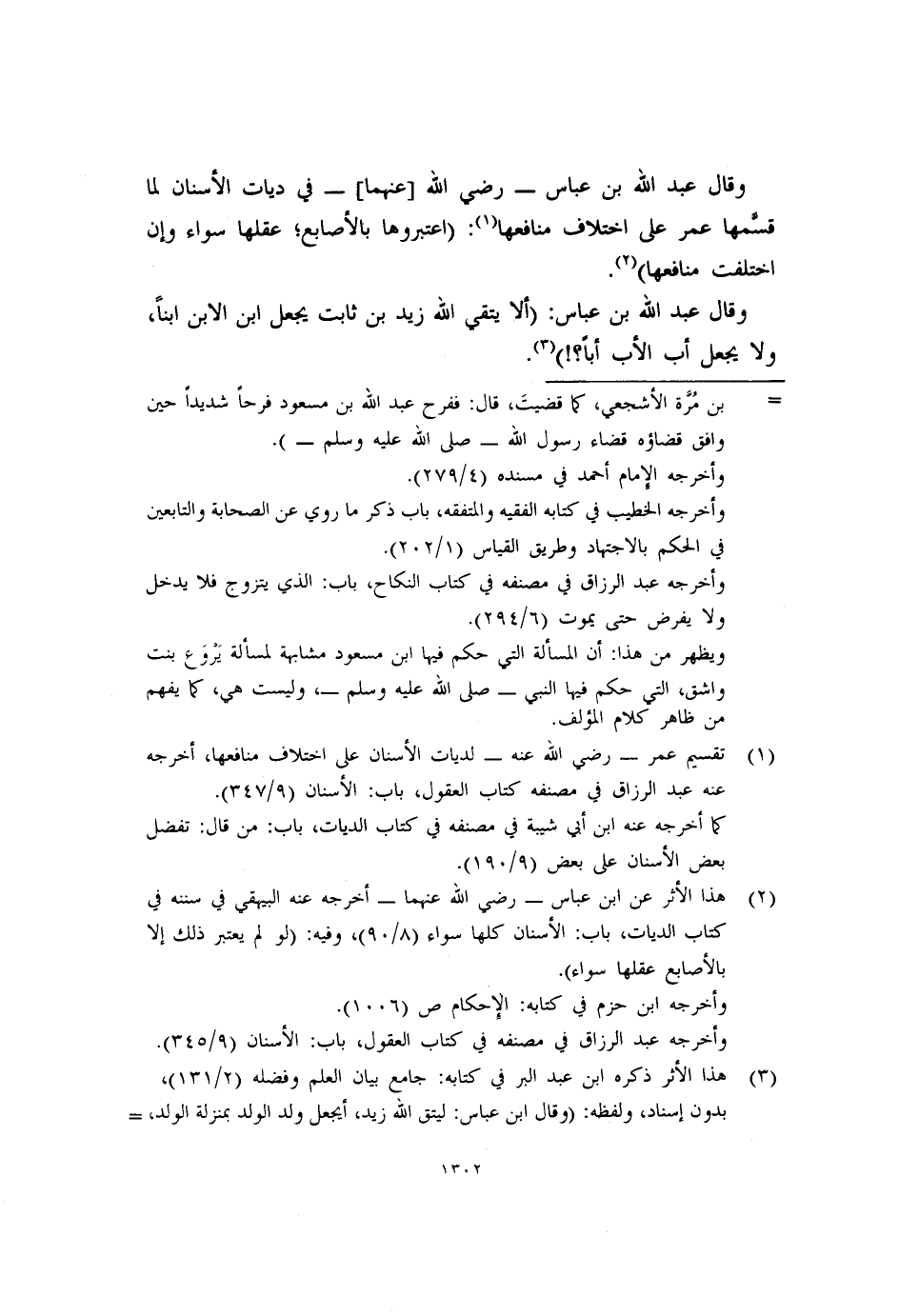 (٢) هذا الأثر عن ابن عباس -رضي الله عنهما- أخرجه عنه البيهقي في سننه في كتاب الديات، باب: الأسنان كلها سواء (٨/٩٠) ، وفيه: (لو لم يعتبر ذلك إلا بالأصابع عقلها سواء) .