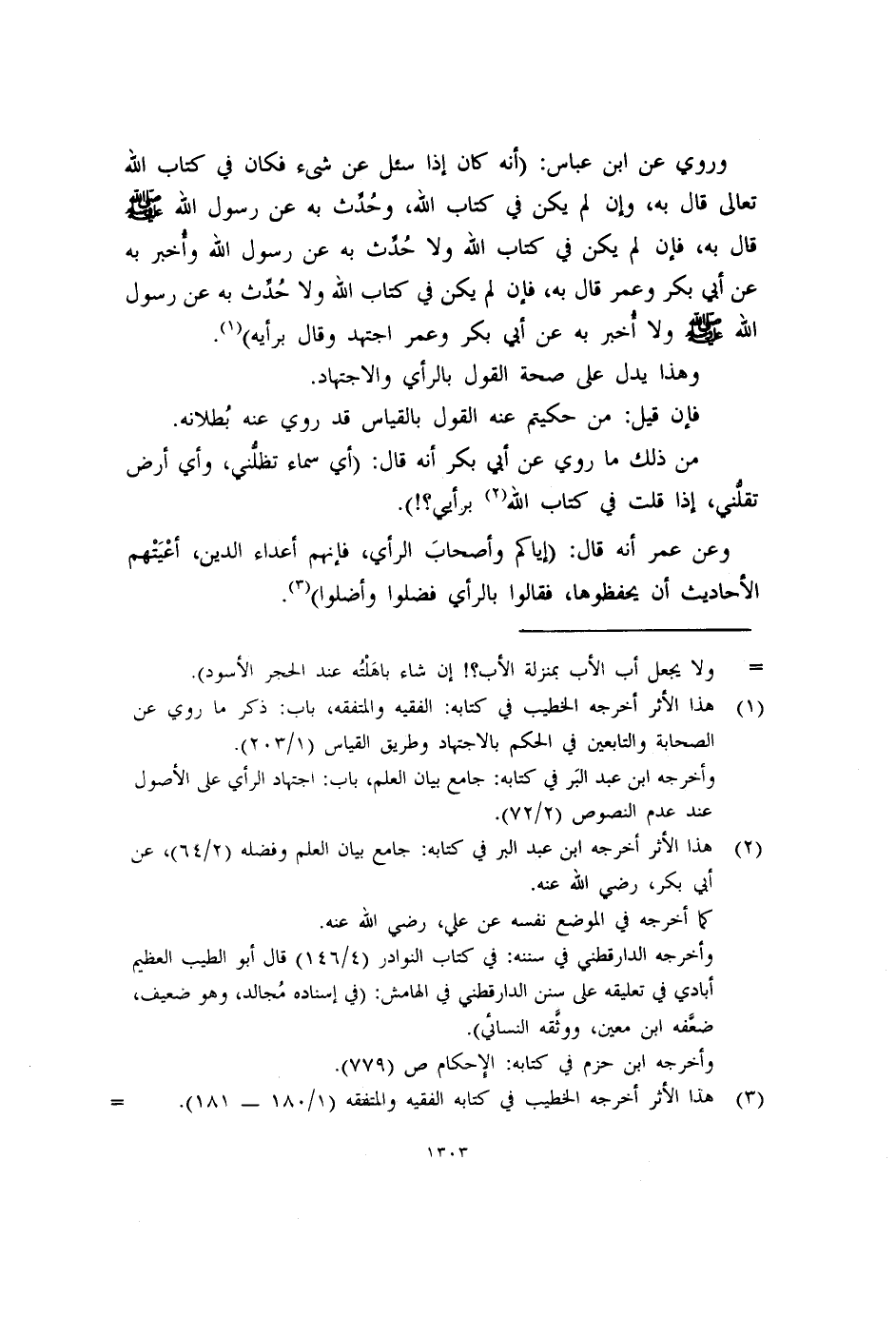 (٣) هذا الأثر أخرجه الخطيب في كتابه الفقيه والمتفقه (١/١٨٠-١٨١) . =