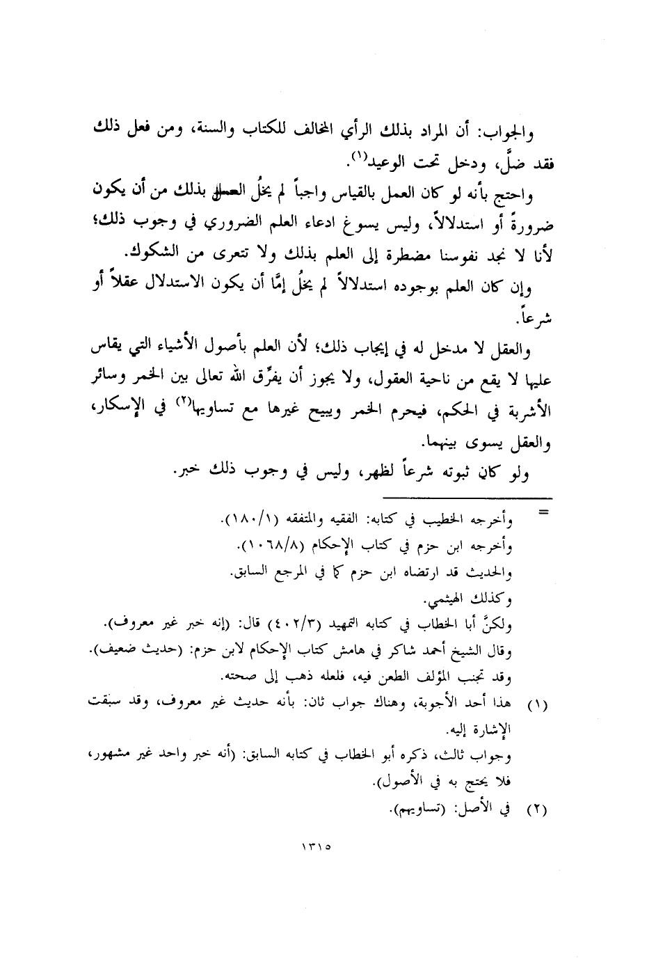 واحتج بأنه لو كان العمل بالقياس واجبا لم يخلُ العمل بذلك من أن يكون ضرورةً أو استدلالاً، وليس يسوغ ادعاء العلم الضروري في وجوب ذلك؛ لأنا لا نجد نفوسنا مضطرة إلى العلم بذلك ولا تتعرى من الشكوك.