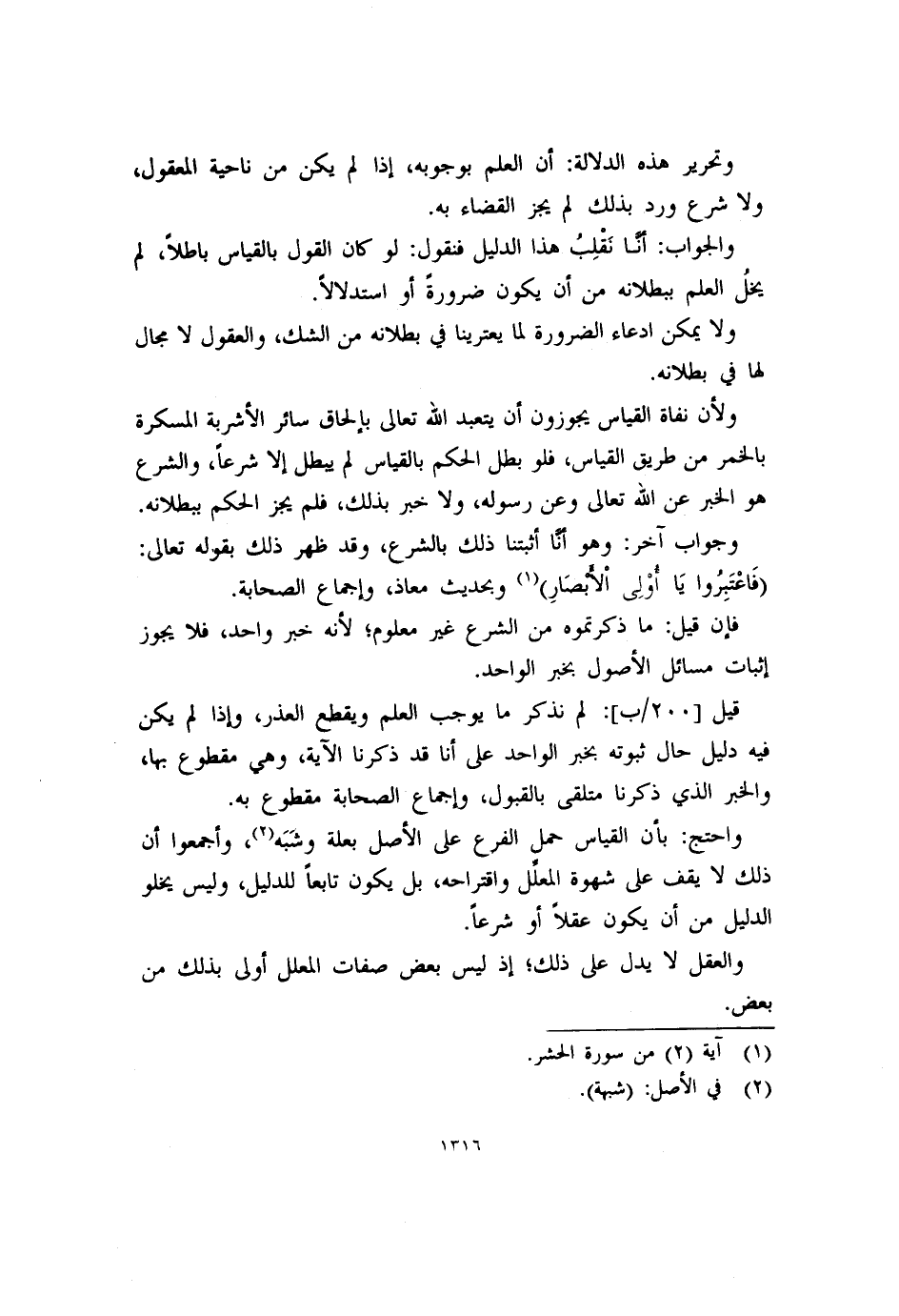 وجواب آخر: وهو أنا أثبتنا ذلك بالشرع، وقد ظهر ذلك بقوله تعالى: (فَاعْتَبِرُوا يَا أوْلِى اْلأبصَارِ) (١) وبحديث معاذ، وإجماع الصحابة.