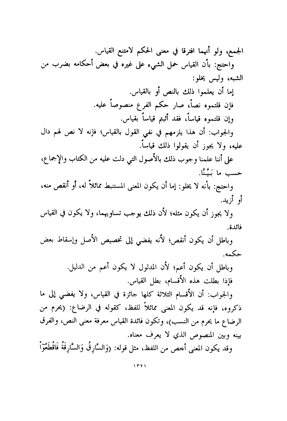 والجواب: أن الأقسام الثلاثة كلها جائزة في القياس، ولا يفضي إلى ما ذكروه، فإنه قد يكون المعنى مماثلاً للفظ، كقوله في الرضاع: (يحرم من الرضاع ما يحرم من النسب) ، وتكون فائدة القياس معرفة معنى النص، والفرق بينه وبين المنصوص الذي لا يعرف معناه.