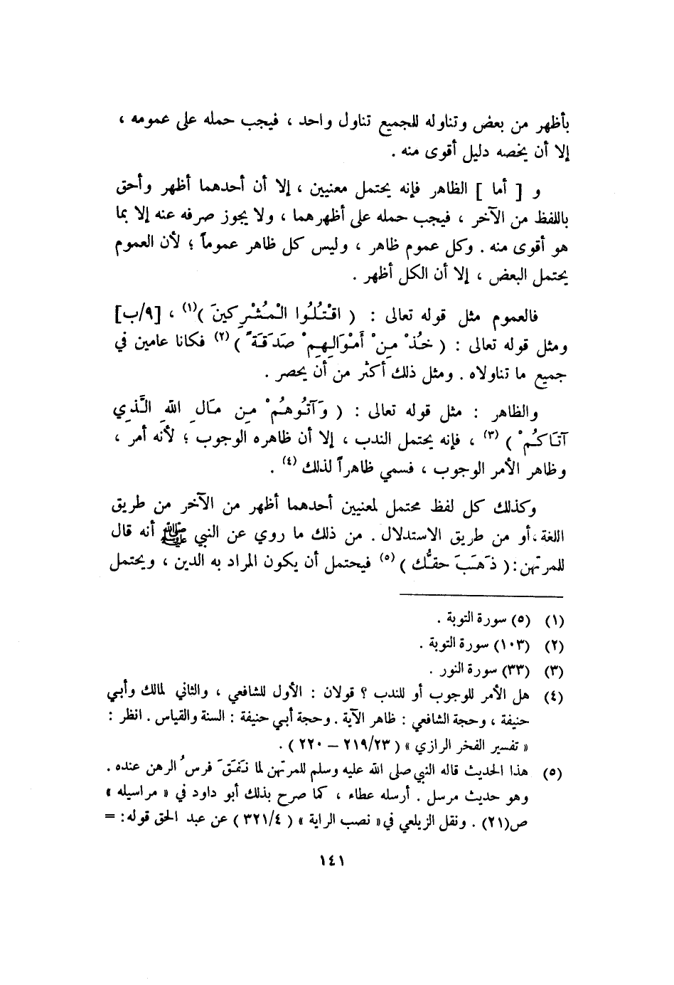 والظاهر: مثل قوله تعالى: {وَآتُوهُمْ مِنْ مَالِ اللَّهِ الَّذِي آتَاكُمْ} ٣، فإنه يحتمل الندب، إلا أن ظاهره الوجوب؛ لأنه أمر وظاهر الأمر الوجوب، فسمي ظاهرًا لذلك٤.
