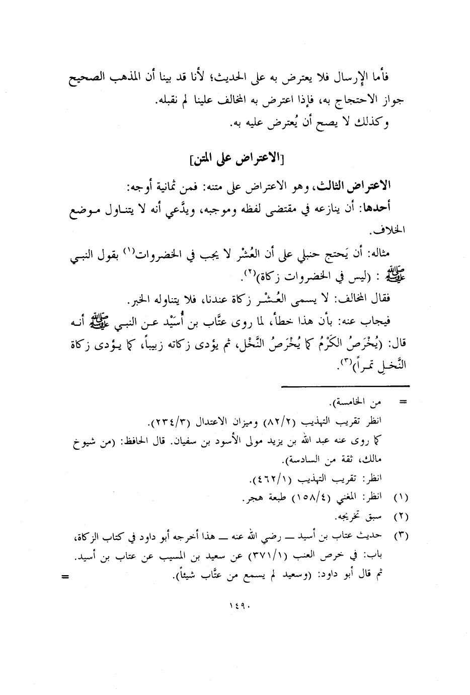 مثاله: أن يَحتج حنبلي على أن العُشْر لا يجب في الخضروات (١) بقول النبي - صلى الله عليه وسلم -: (ليس في الخضروات زكاة) (٢) .