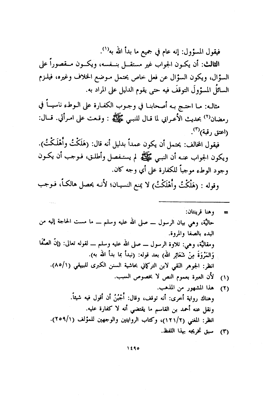 الثالث: أن يكون الجواب غير مستقل بنفسه، ويكون مقصوراً على السؤال، ويكون السؤال عن فعل خاص يحتمل موضع الخلاف وغيره، فيلزم السائلُ المسؤولَ التوقفَ فيه حتى يقوم الدليل على المراد به.