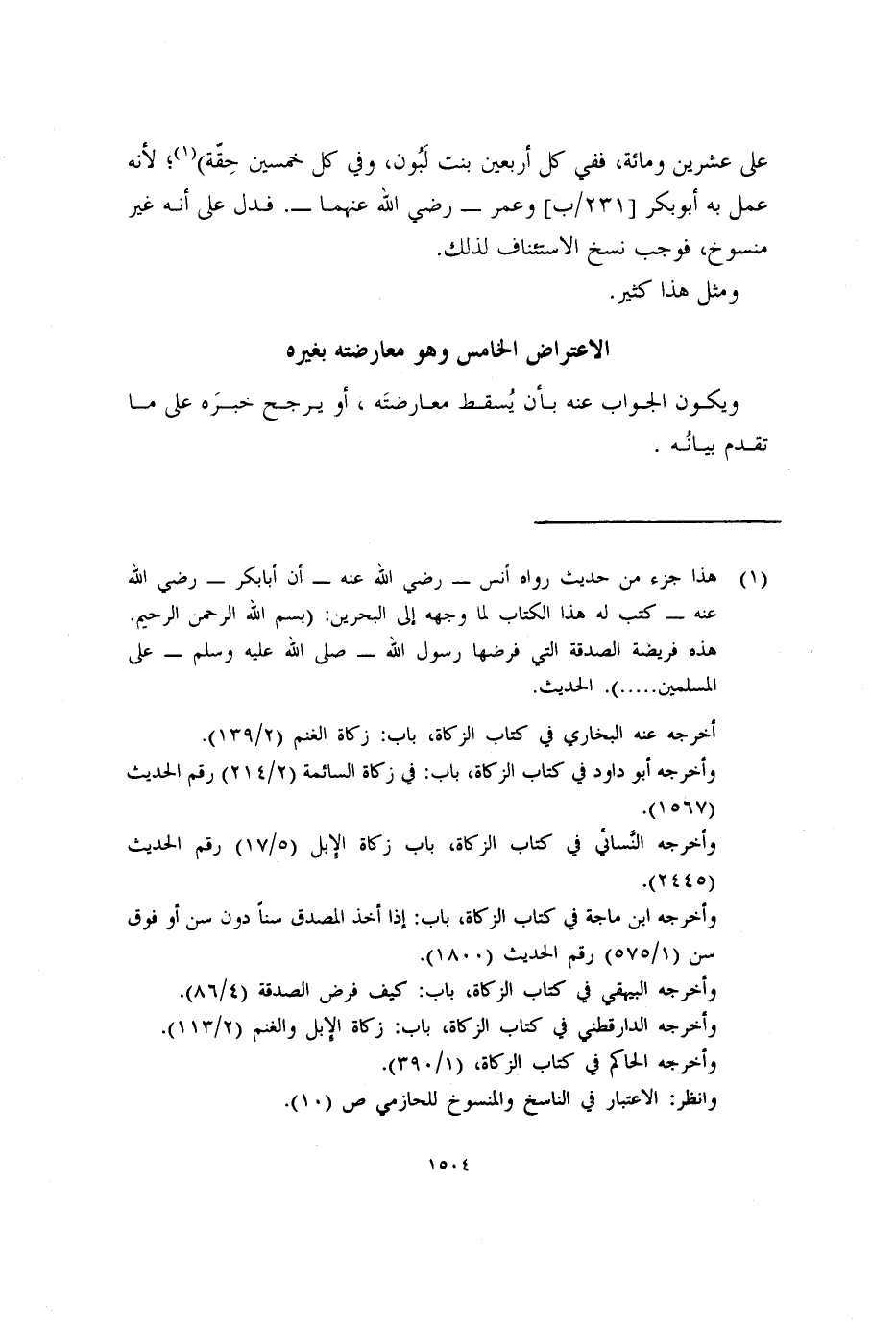 على عشرين ومائة، ففي كل أربعين بنت لَبُون، وفي كل خمسين حِقّة) (١) ؛ لأنه عمل به أبو بكر [٢٣١/ب] وعمر- رضي الله عنهما-. فدل على أنه غير منسوخ، فوجب نسخ الاستئناف لذلك.