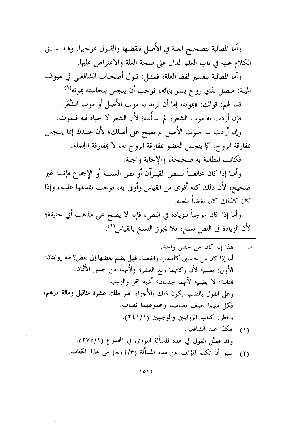 وأما المطالبة بتفسير لفظ العلة، فمثل: قول أصحاب الشافعي في صوف الميتة: متصل بذي روح ينمو بنمائه، فوجب أن ينجس بنجاستِه بموته (١) .