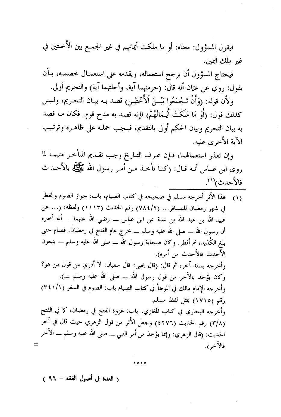 (١) هذا الأثر أخرجه مسلم في صحيحه في كتاب الصيام، باب: جواز الصوم والفطر في شهر رمضان للمسافر ... (٢/٧٨٤) رقم الحديث (١١١٣) ولفظه: ( ... عن عبيد الله بن عبد الله بن عتبة عن ابن عباس -رضي الله عنهما- أنه أخبره أن رسول الله - صلى الله عليه وسلم - خرج عام الفتح في رمضان. فصام حتى بلغ الكُدَيد، ثم أفطر. وكان صحابة رسول الله - صلى الله عليه وسلم - يتبعون الأحدث فالأحدث من أمره) .