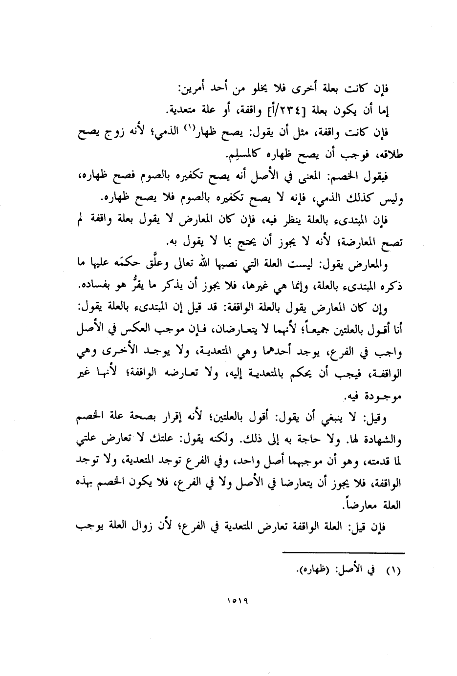 وقيل: لا ينبغي أن يقول: أقول بالعلتين؛ لأنه إقرار بصحة علة الخصم والشهادة لها. ولا حاجة به إلى ذلك. ولكنه يقول: علتك لا تعارض علتي لما قدمته، وهو أن موجبهما أصل واحد، وفي الفرع توجد المتعدية، ولا توجد الواقفة، فلا يجوز أن يتعارضا في الأصل ولا في الفرع، فلا يكون الخصم بهذه العلة معارضاً.