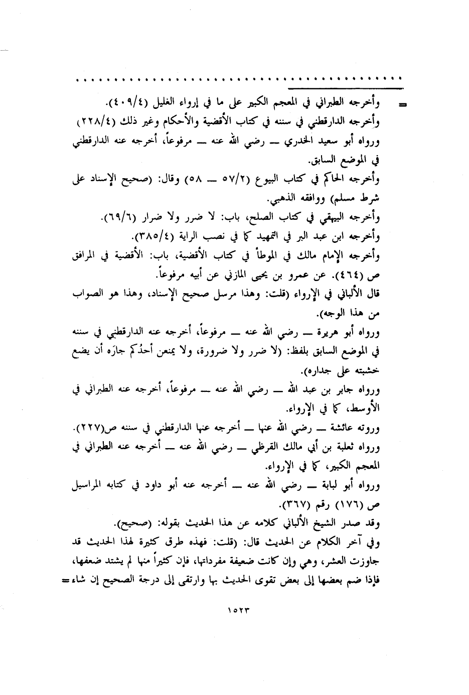 وأخرجه الدارقطني في سننه في كتاب الأقضية والأحكام وغير ذلك (٤/٢٢٨) ورواه أبو سعيد الخدري - رضي الله عنه - مرفوعاً، أخرجه عنه الدارقطني في الموضع السابق.