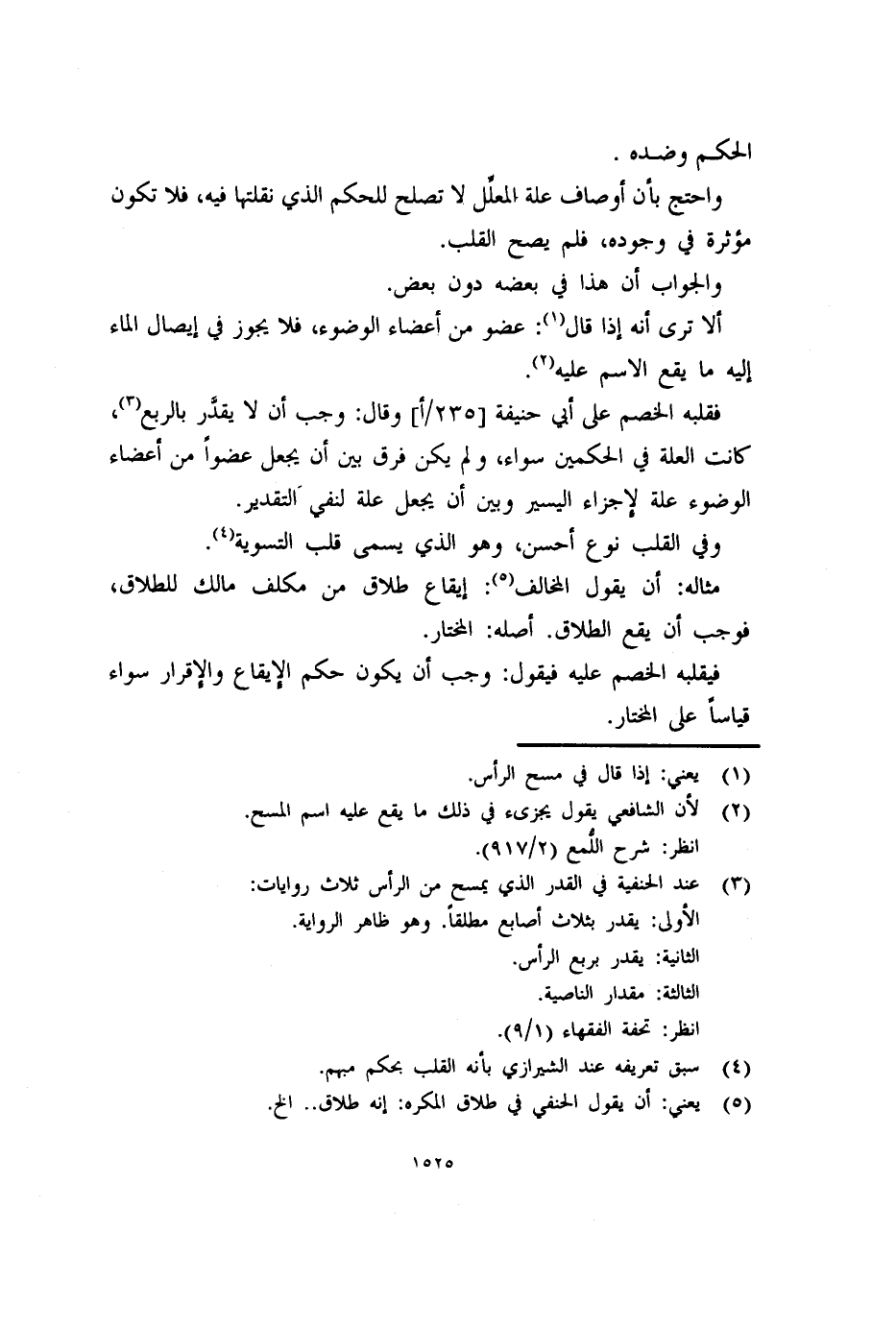 فقلبه الخصم على أبي حنيفة [٢٣٥/أ] وقال: وجب أن لا يقدَّر بالربع (٣) ، كانت العلة في الحكمين سواء، ولم يكن فرق بين أن يجعل عضواً من أعضاء الوضوء علة لإِجزاء اليسير وبين أن يجعل علة لنفي التقدير.