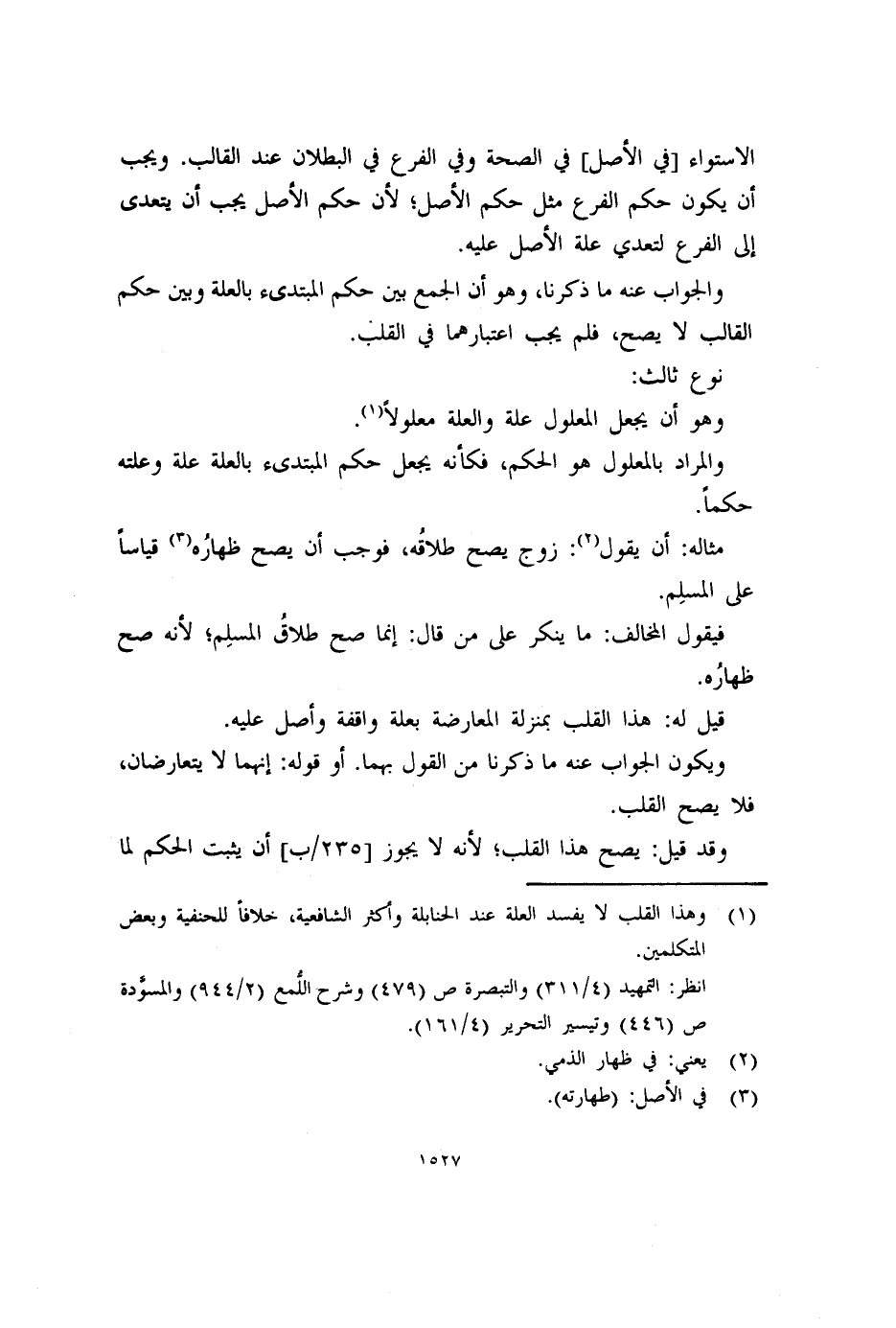 (١) وهذا القلب لا يفسد العلة عند الحنابلة وأكثر الشافعية، خلافاً للحنفية وبعض المتكلمين.
