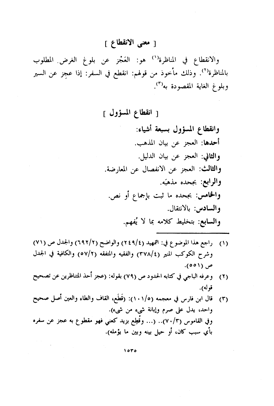 (٢) وعرفه الباجي في كتابه الحدود ص (٧٩) بقوله: (عجز أحد المتناظرين عن تصحيح قوله) .