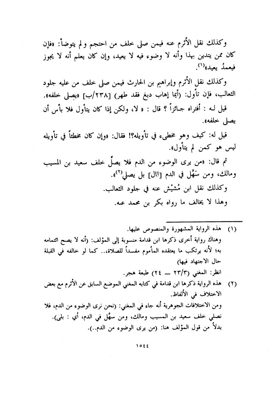 ومن الاختلافات الجوهرية أنه جاء في المغني: (نحن نرى الوضوء من الدم، فلا نصلى خلف سعيد بن المسيب ومالك، ومن سهَّل في الدم، أي: بلى) .