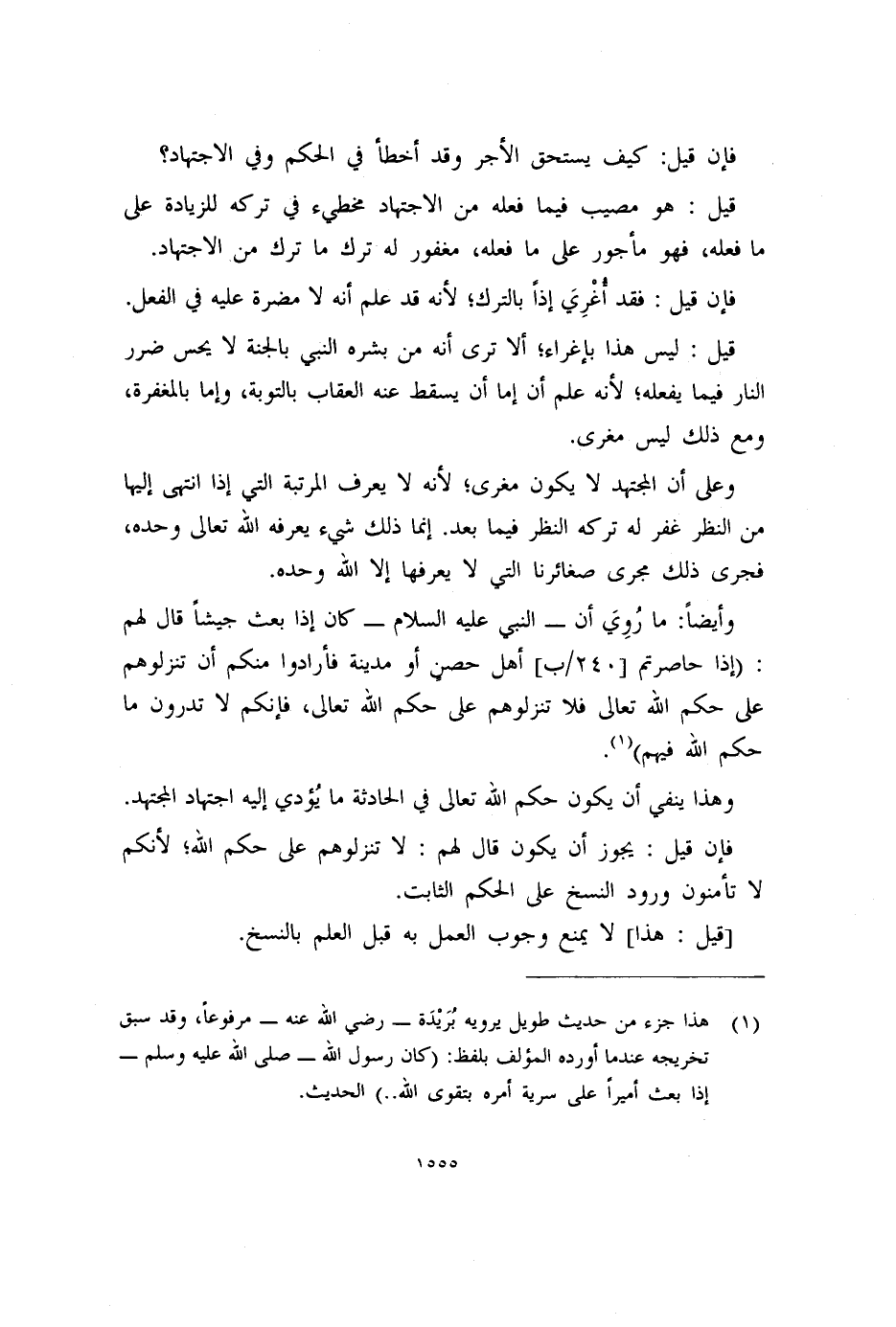 وأيضاً: ما رُوِيَ أن -النبي عليه السلام- كان إذا بعث جيشاً قال لهم: (إذا حاصرتم [٢٤٠/ب] أهل حصنِ أو مدينة فأرادوا منكم أن تنزلوهم على حكم الله تعالى فلا تنزلوهم على حكم الله تعالى، فإنكم لا تدرون ما حكم الله فيهم) (١) .