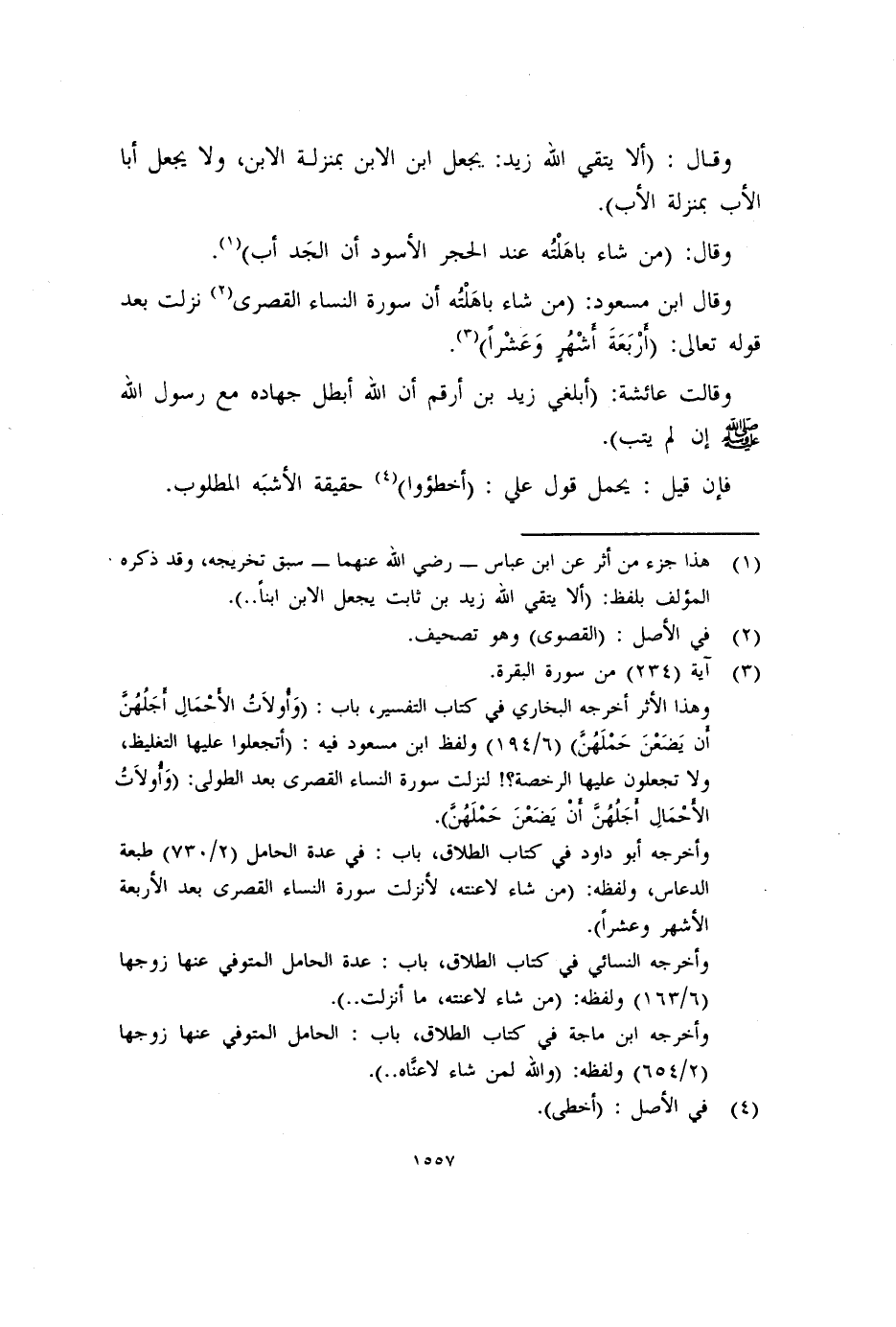 وهذا الأثر أخرجه البخاري في كتاب التفسير، باب: (وَأولاَتُ الأحْمَالِ أجَلُهُنَّ أن يَضَعْنَ حَمْلَهُنَّ) (٦/١٩٤) ولفظ ابن مسعود فيه: (أتجعلوا عليها التغليظ، ولا تجعلون عليها الرخصة؟! لنزلت سورة النساء القصرى بعد الطولى: (وَأولاَتُ الأحمَالِ أجَلُهُنَّ أن يَضَعْنَ حَمْلَهُنَّ) .